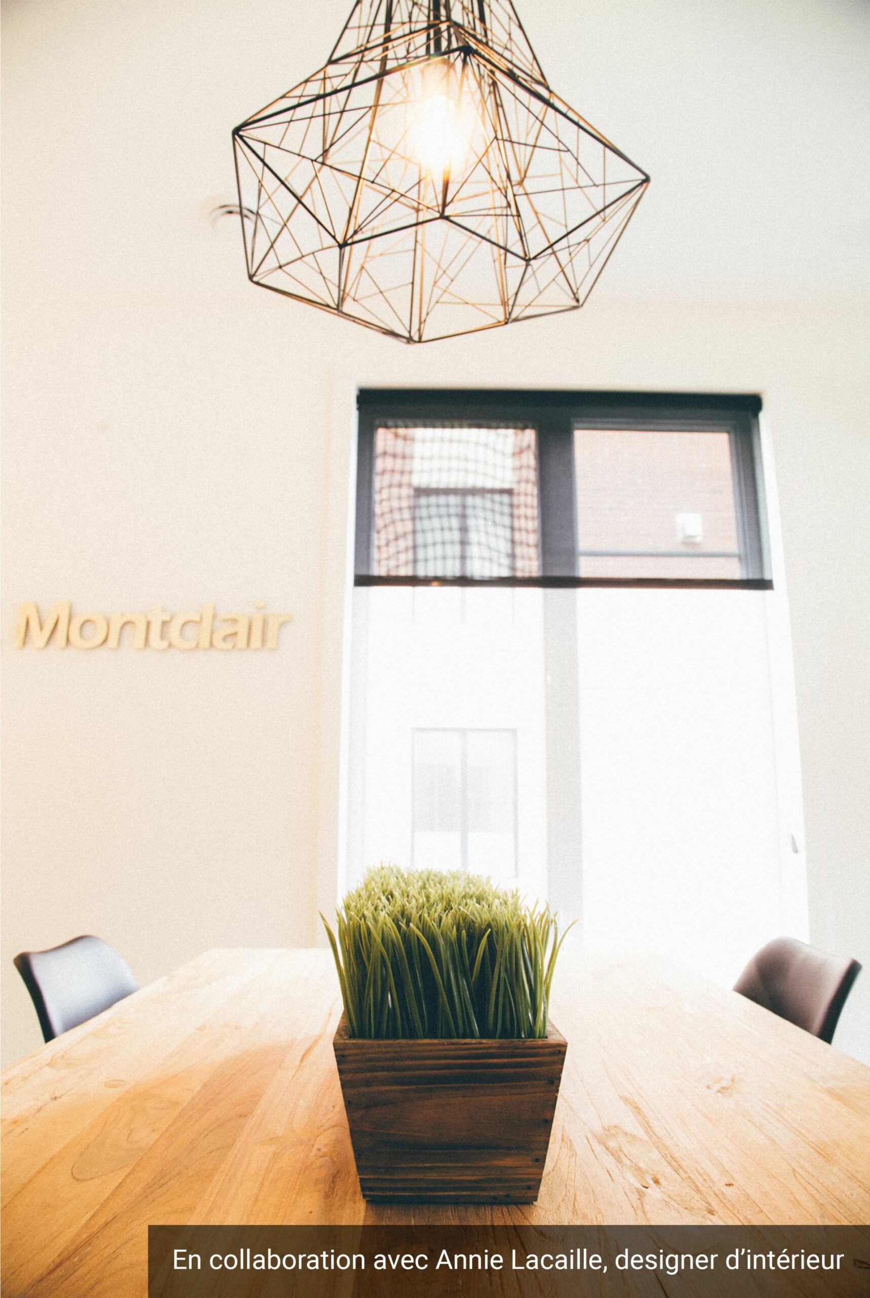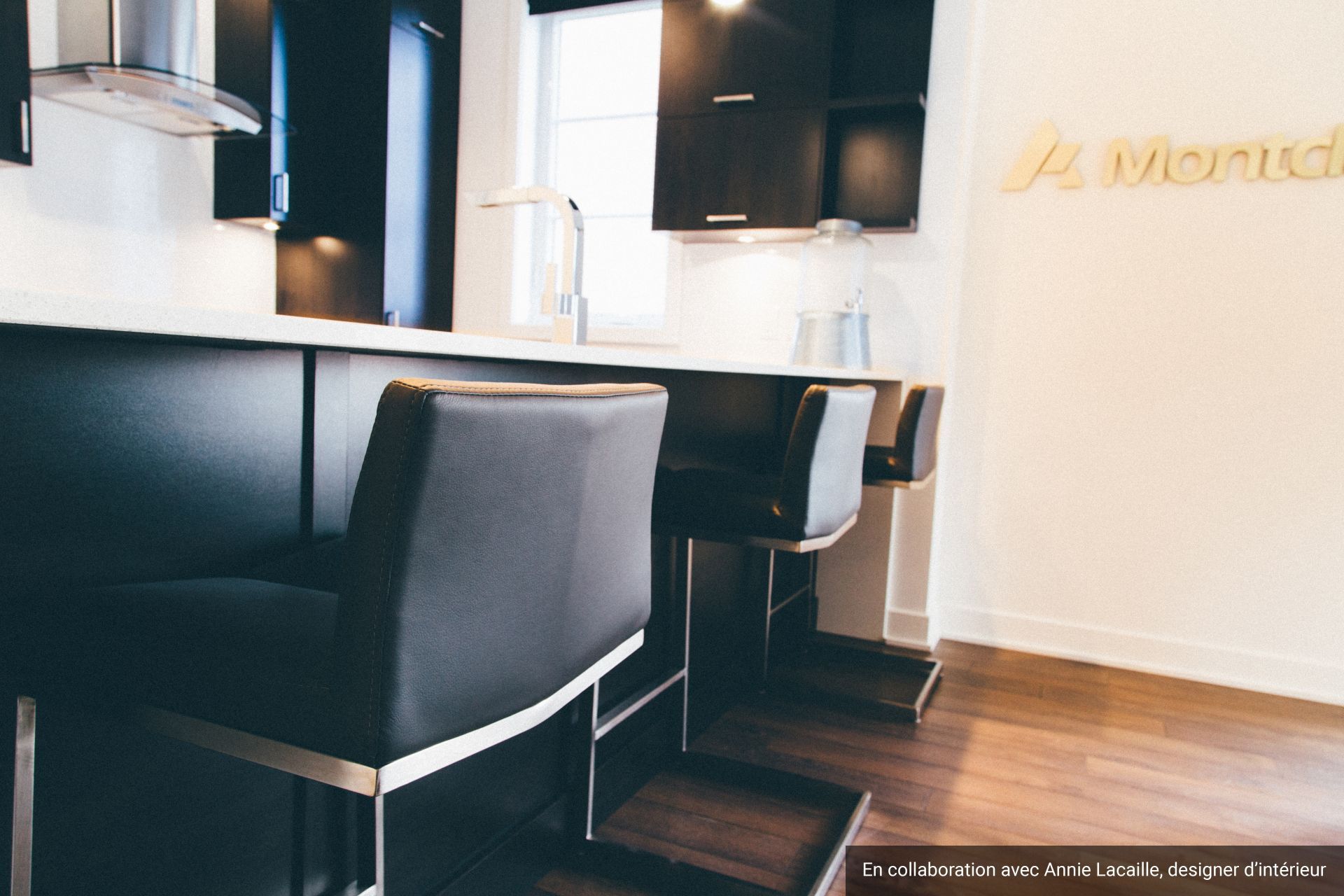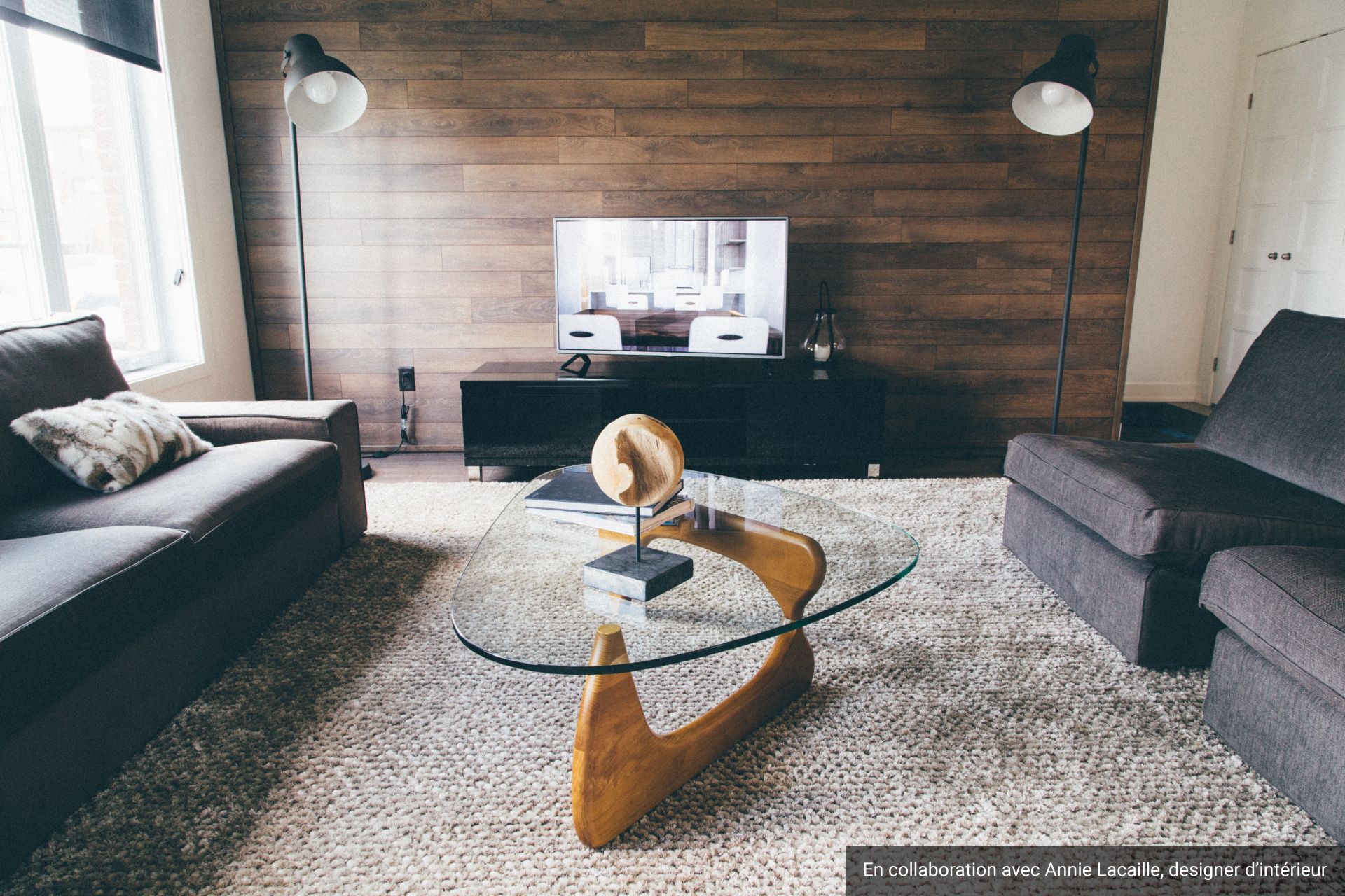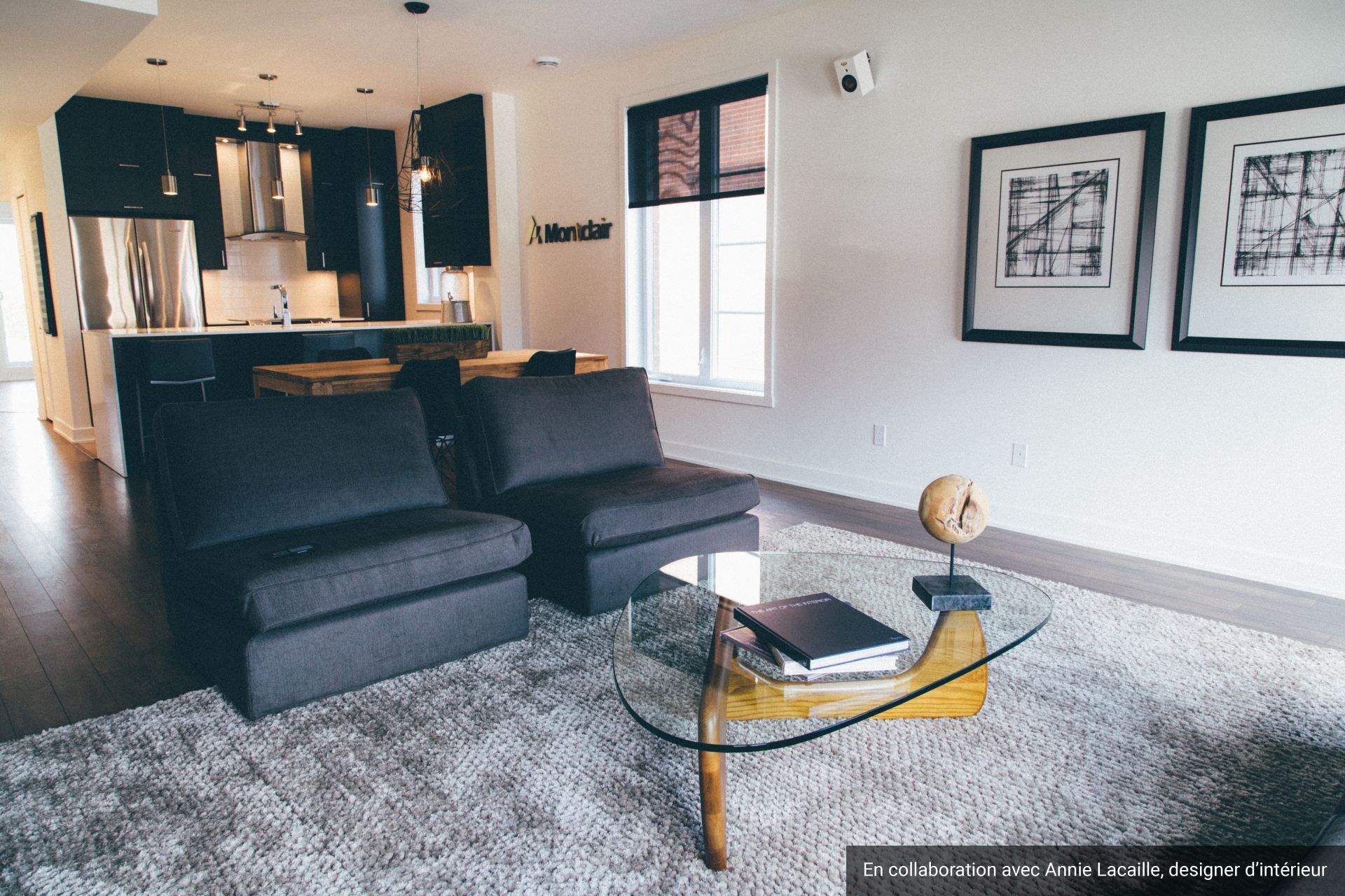 Condo modèle à Ville St-Laurent pour le Groupe Montclair. Aménagement contemporain aux tons sobres et intemporels. Un mur de bois fut créé au salon, poursuivant ainsi le plancher, ce qui procure un effet de profondeur à la pièce. Les différentes textures sont importantes dans cet aménagement, elles lui donnent du caractère; le verre de la table de salon pour l’effet lumineux, le bois du mobilier pour réchauffer l’ambiance, le métal des luminaires pour une allure industrielle et les fibres naturelles des canapés pour leur confort.