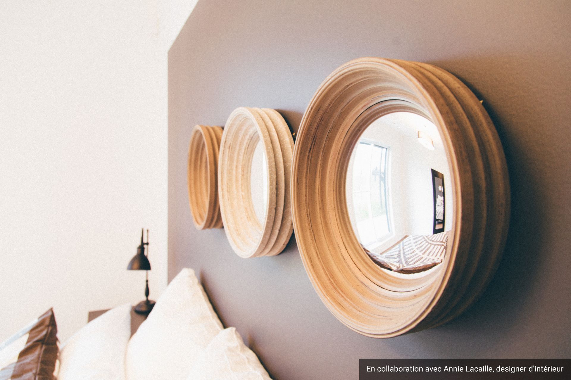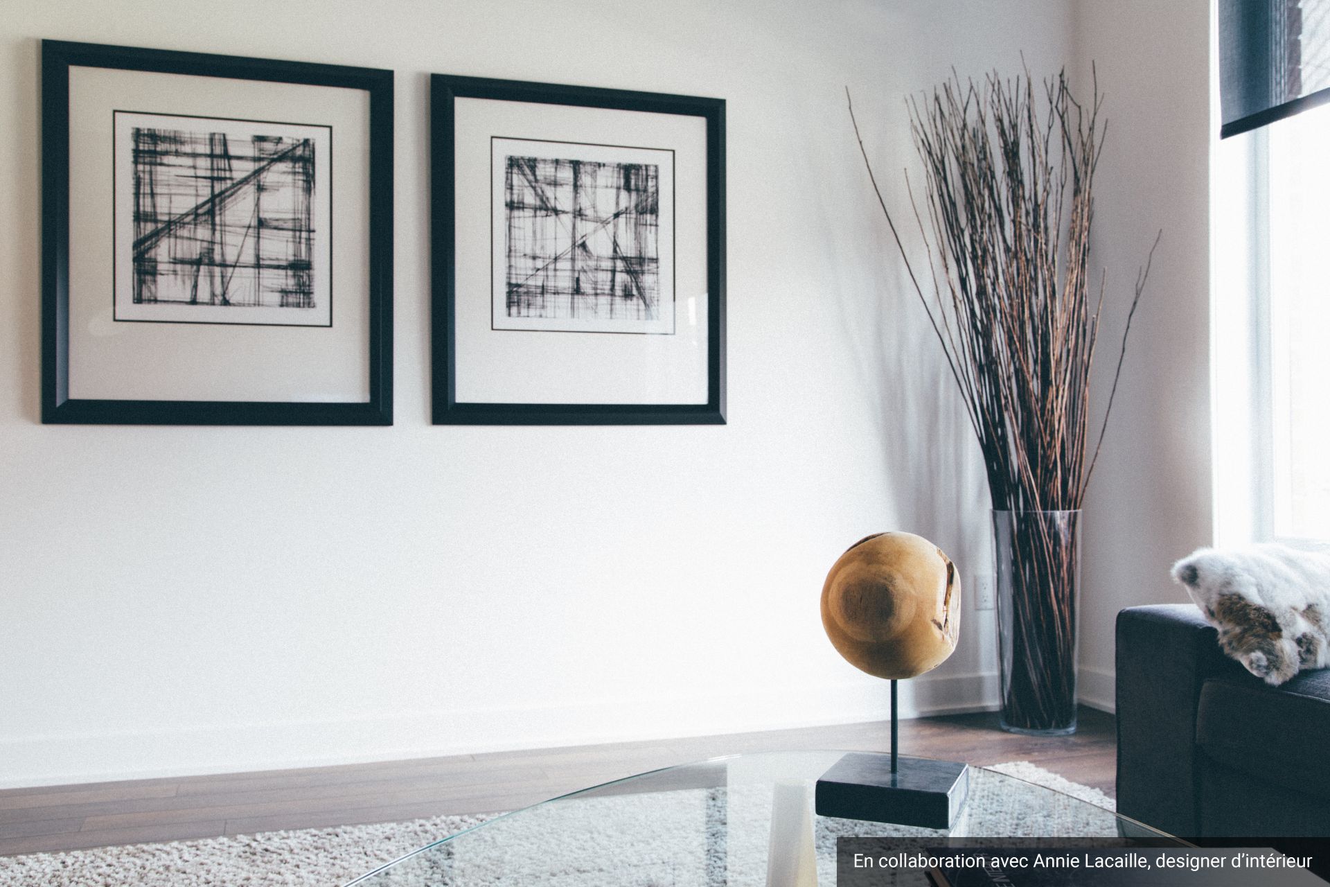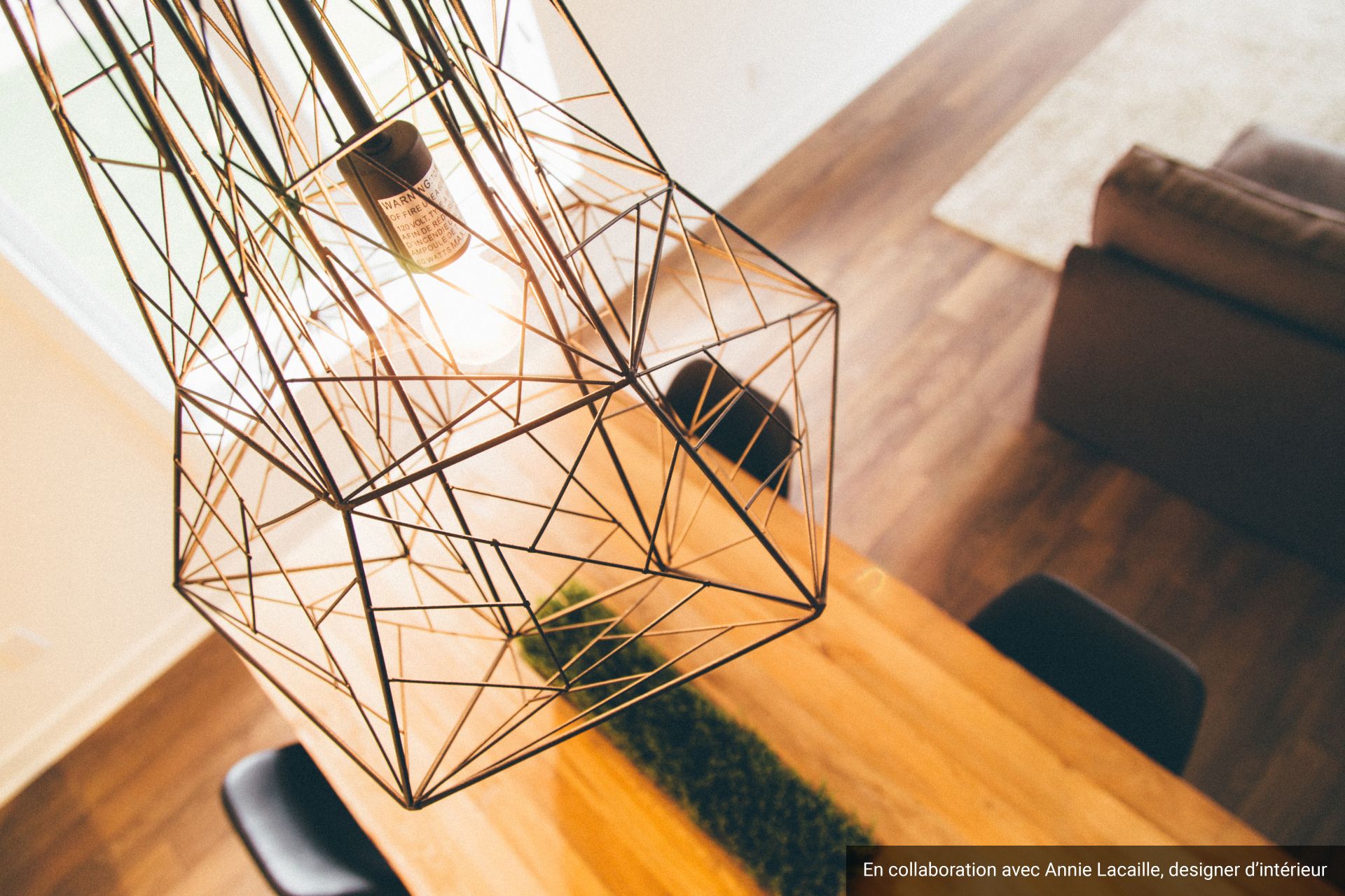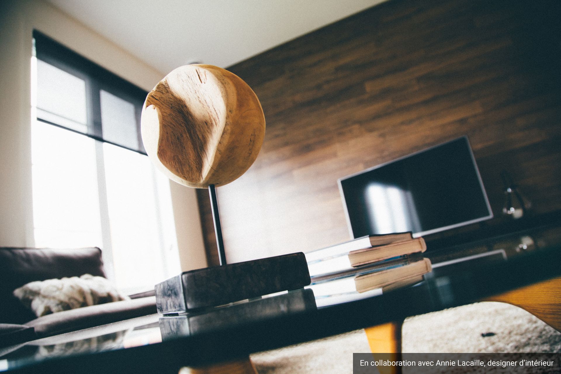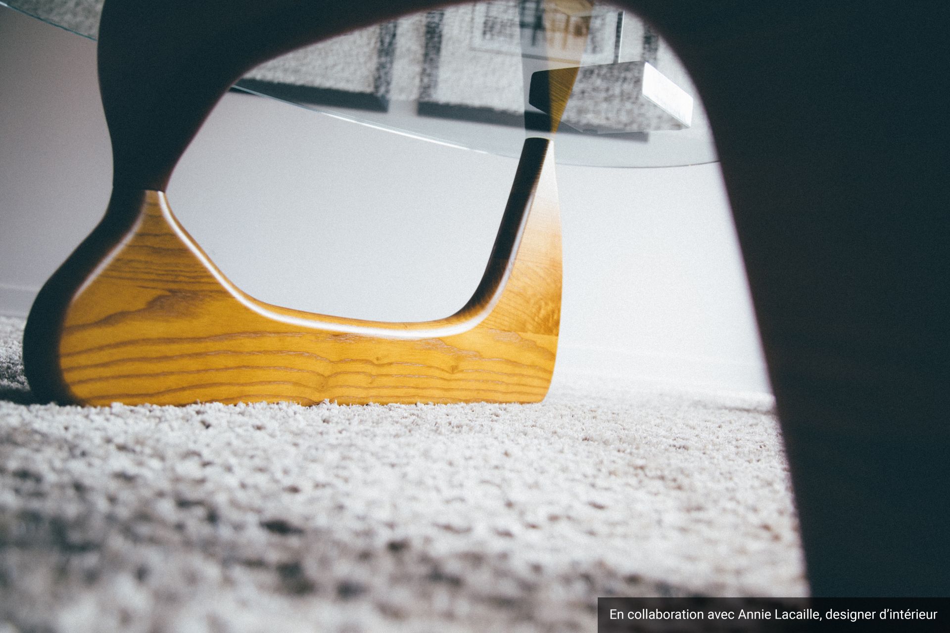 Condo modèle à Ville St-Laurent pour le Groupe Montclair. Aménagement contemporain aux tons sobres et intemporels. Un mur de bois fut créé au salon, poursuivant ainsi le plancher, ce qui procure un effet de profondeur à la pièce. Les différentes textures sont importantes dans cet aménagement, elles lui donnent du caractère; le verre de la table de salon pour l’effet lumineux, le bois du mobilier pour réchauffer l’ambiance, le métal des luminaires pour une allure industrielle et les fibres naturelles des canapés pour leur confort.
