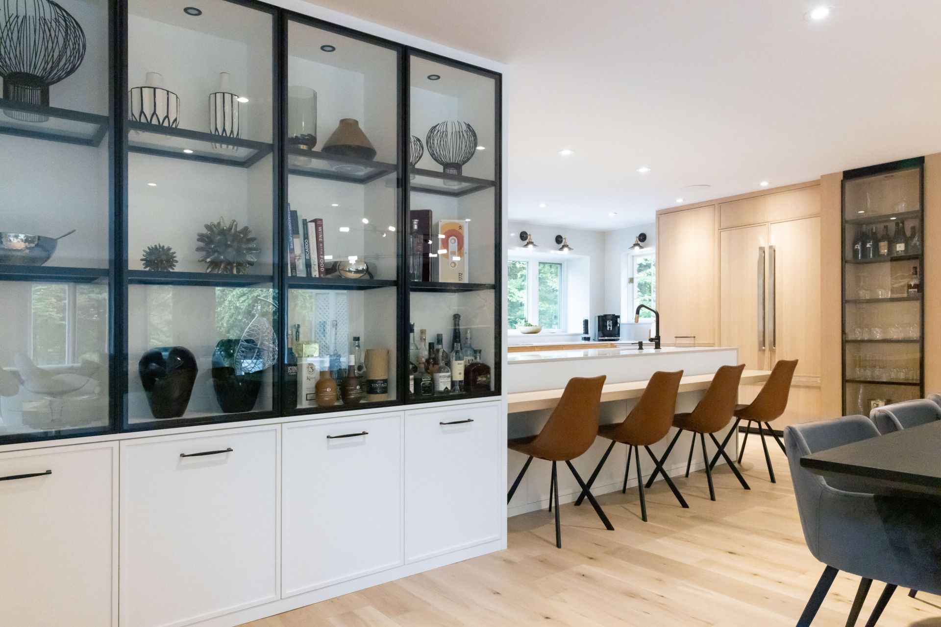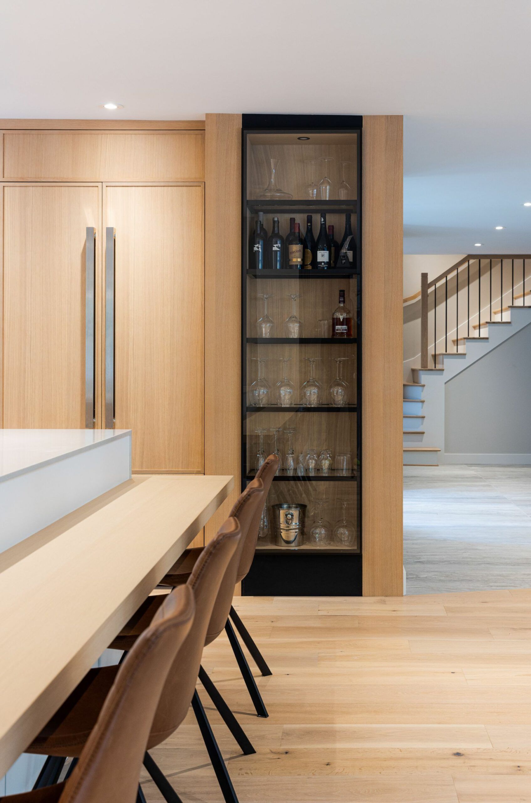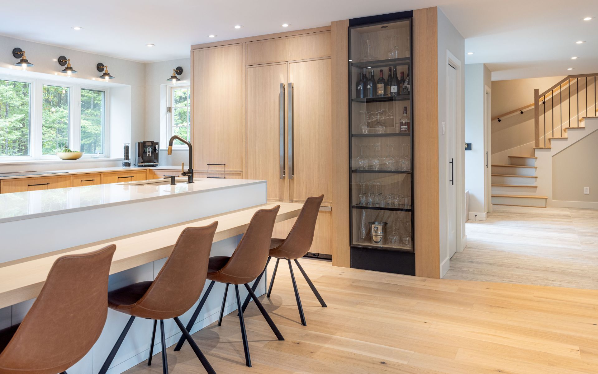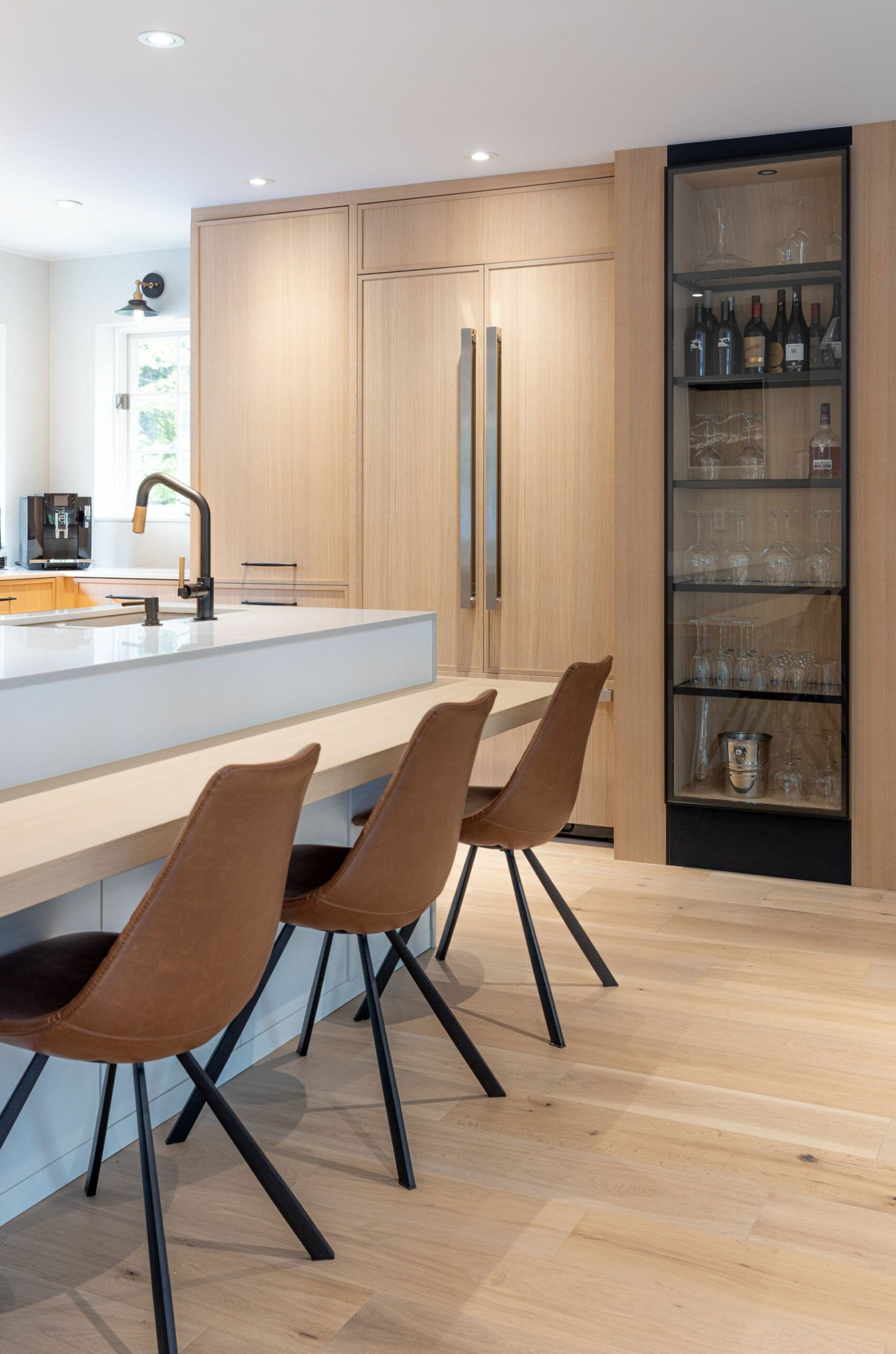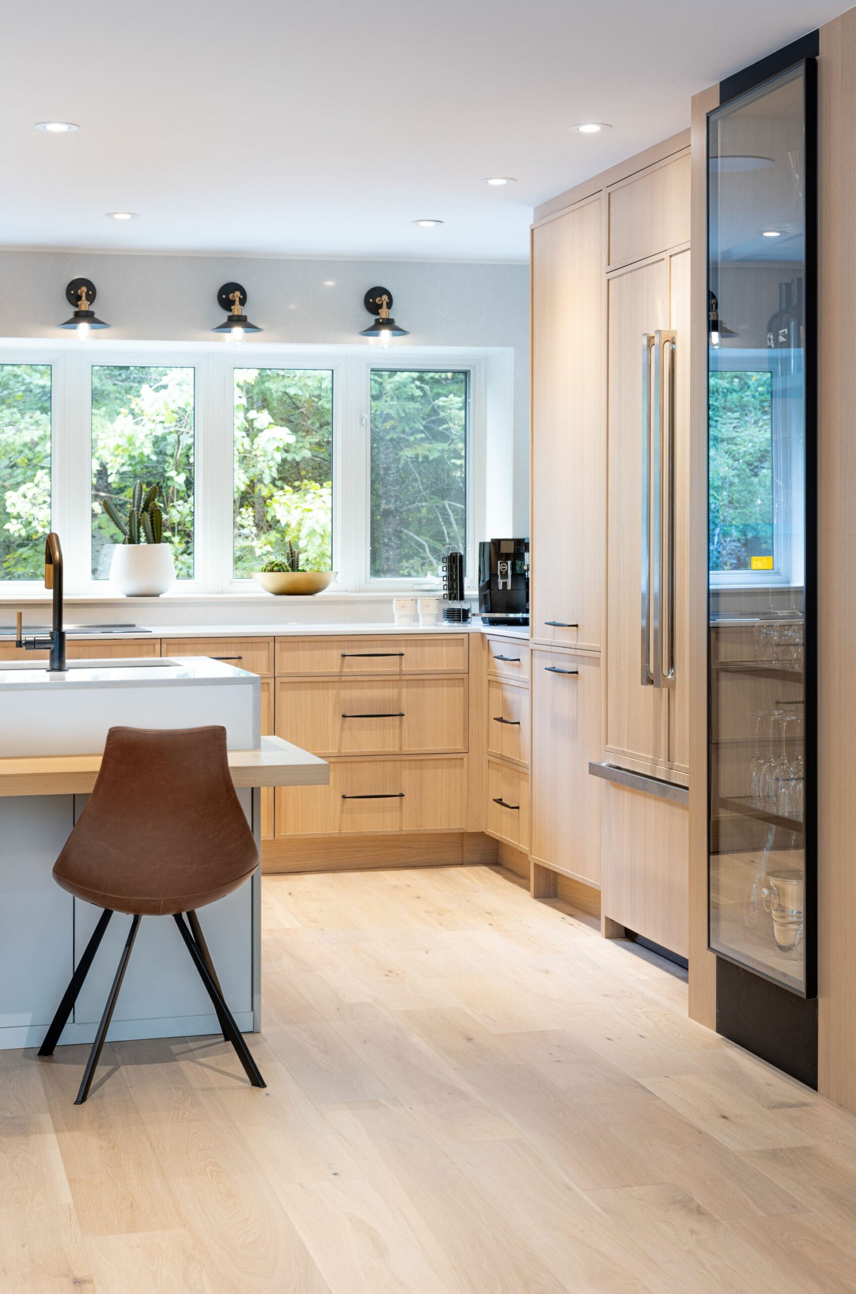 M. Ponce a fait appel à mes services sa maison secondaire à Saint-Adolphe d’Howard. J’ai planifié la cuisine afin que celle-ci soit plus ouverte sur l’aire de vie. Elle est ainsi plus conviviale. De grandes vitrines ont aussi été aménagées. Une fois allumées le soir, elles créent une belle ambiance feutrée dans la salle à manger. Le chêne blanc Rif Cut est en vedette dans cette magnifique cuisine, dû à son grain raffiné et sa teinte douce et chaleureuse.
