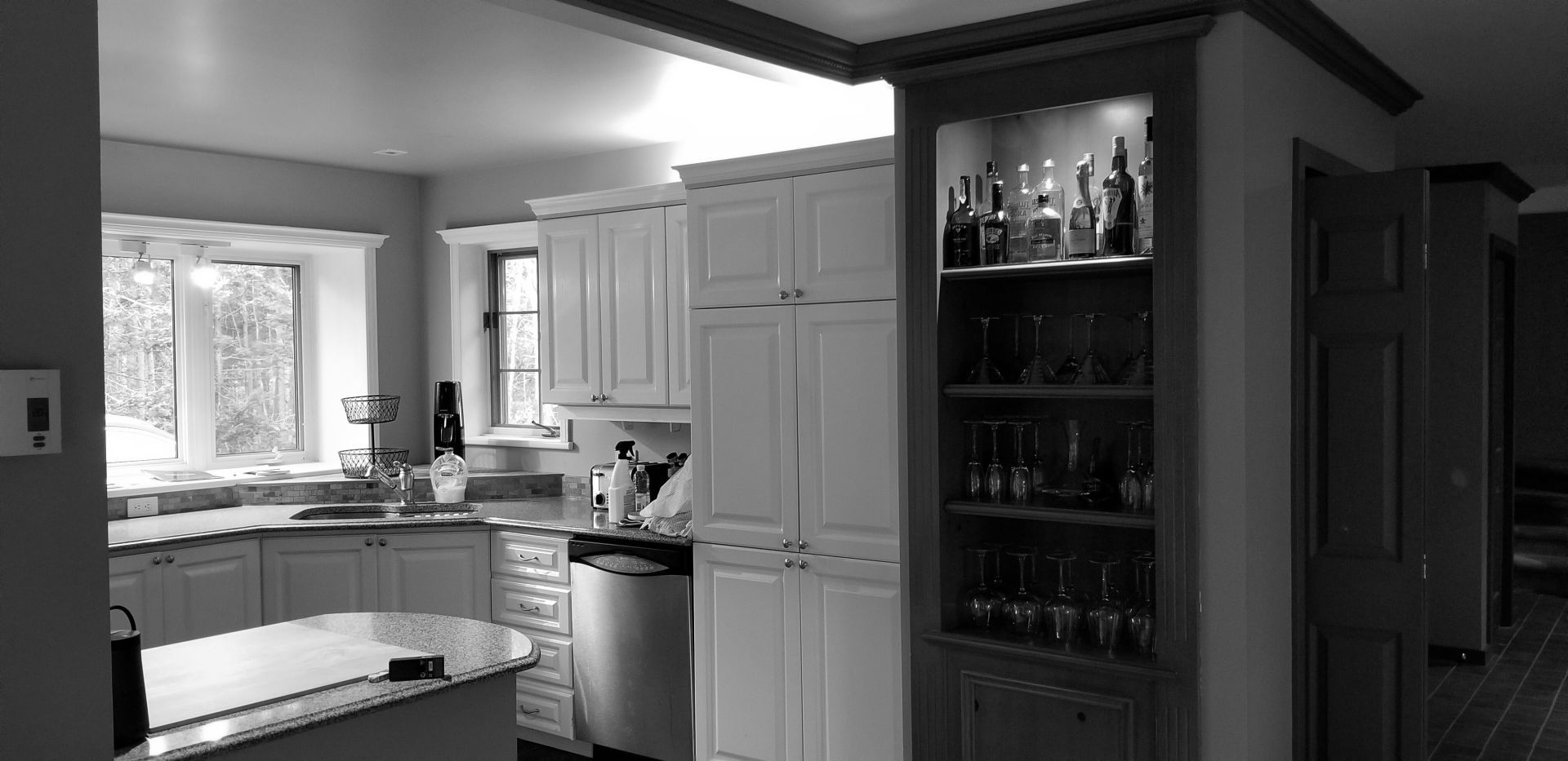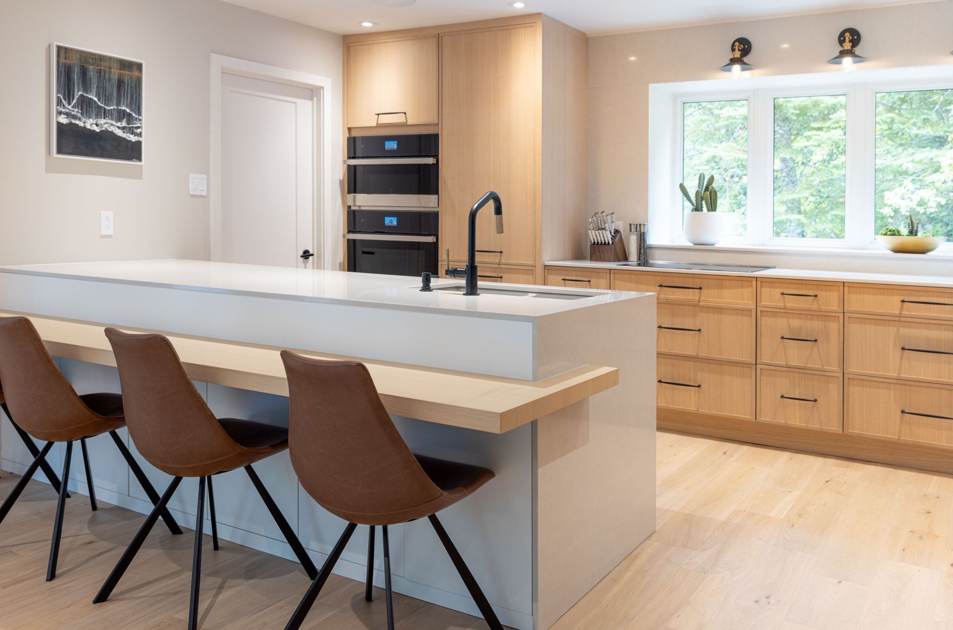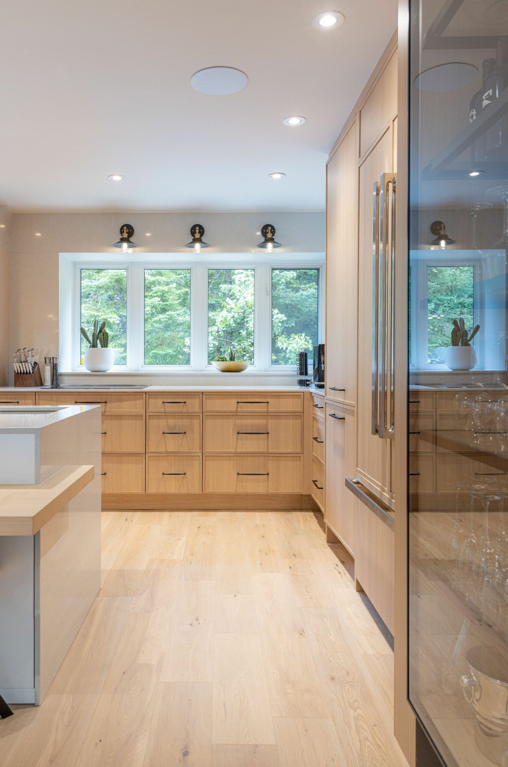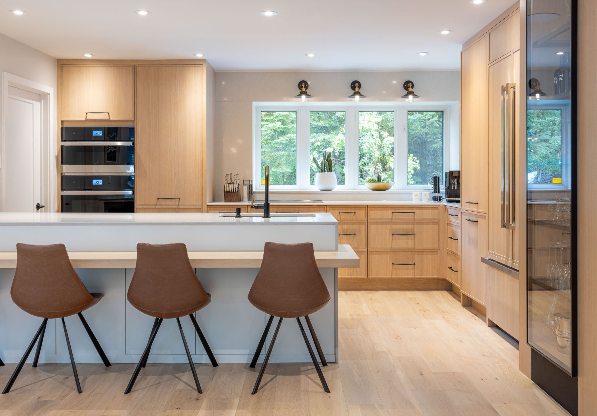 M. Ponce a fait appel à mes services sa maison secondaire à Saint-Adolphe d’Howard. J’ai planifié la cuisine afin que celle-ci soit plus ouverte sur l’aire de vie. Elle est ainsi plus conviviale. De grandes vitrines ont aussi été aménagées. Une fois allumées le soir, elles créent une belle ambiance feutrée dans la salle à manger. Le chêne blanc Rif Cut est en vedette dans cette magnifique cuisine, dû à son grain raffiné et sa teinte douce et chaleureuse.