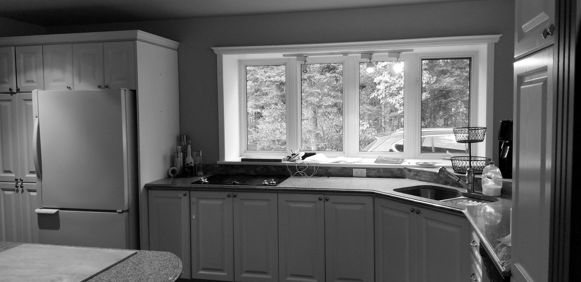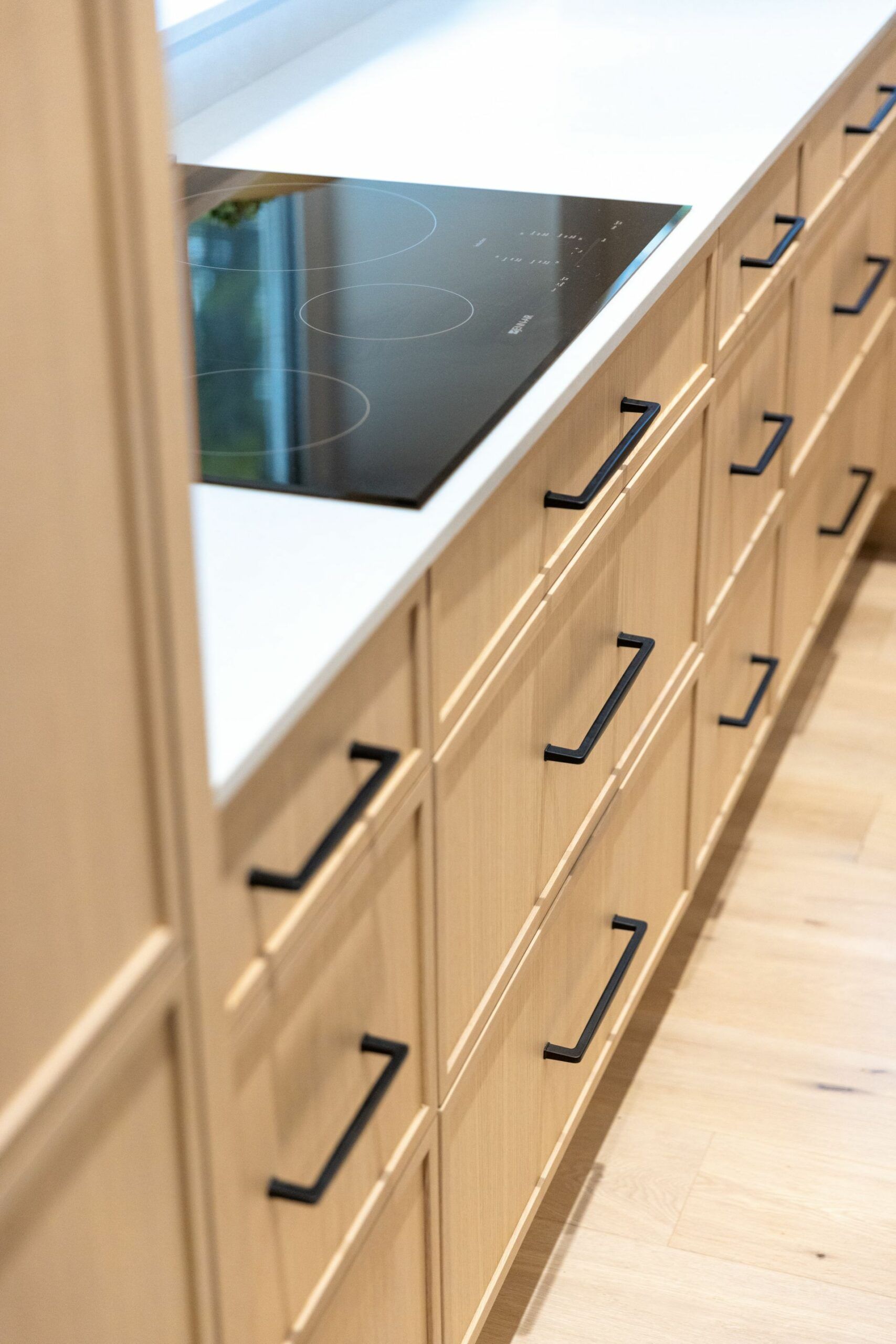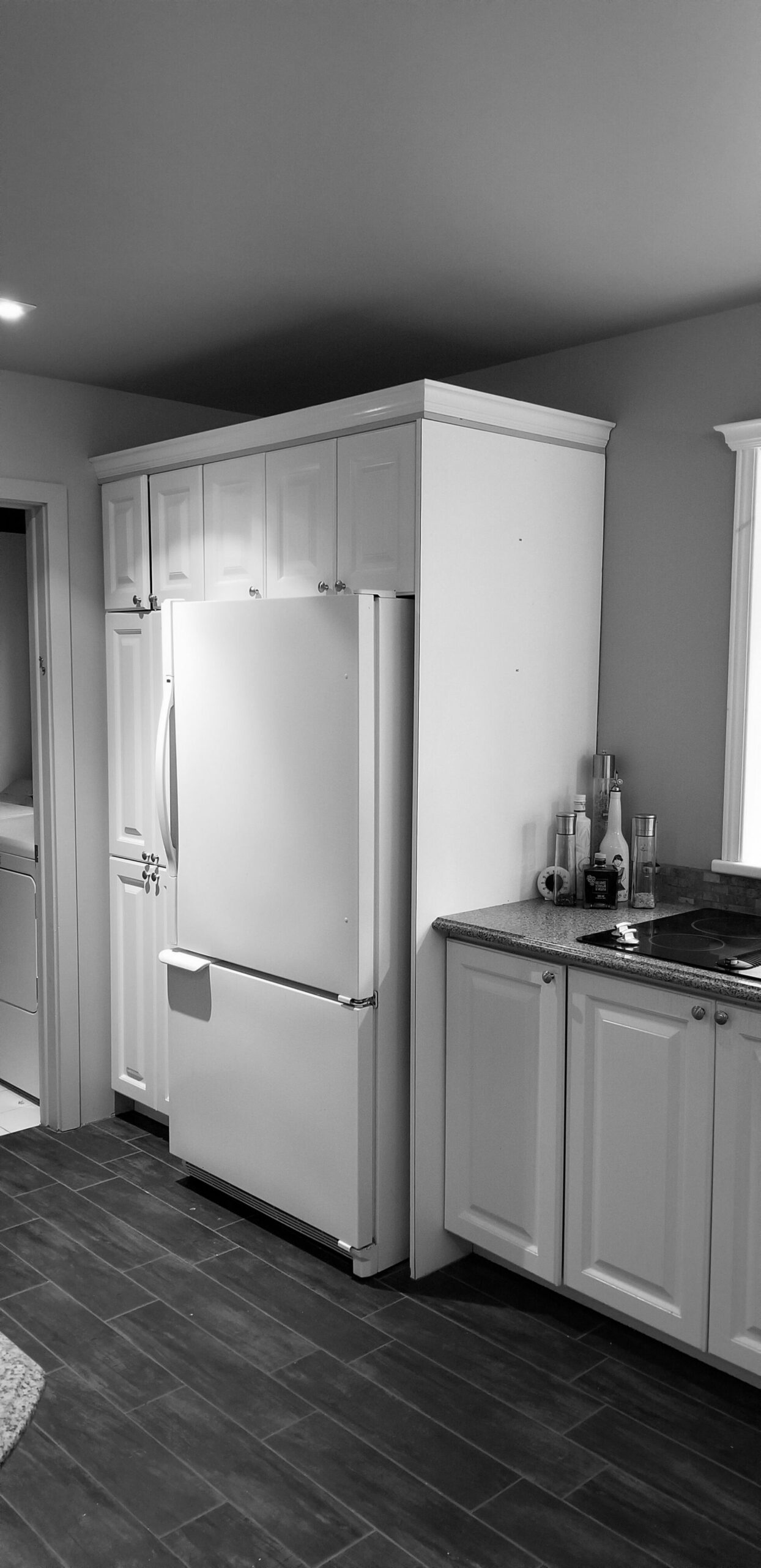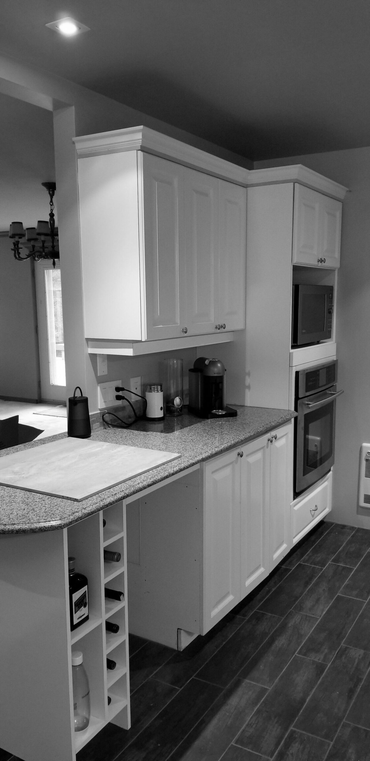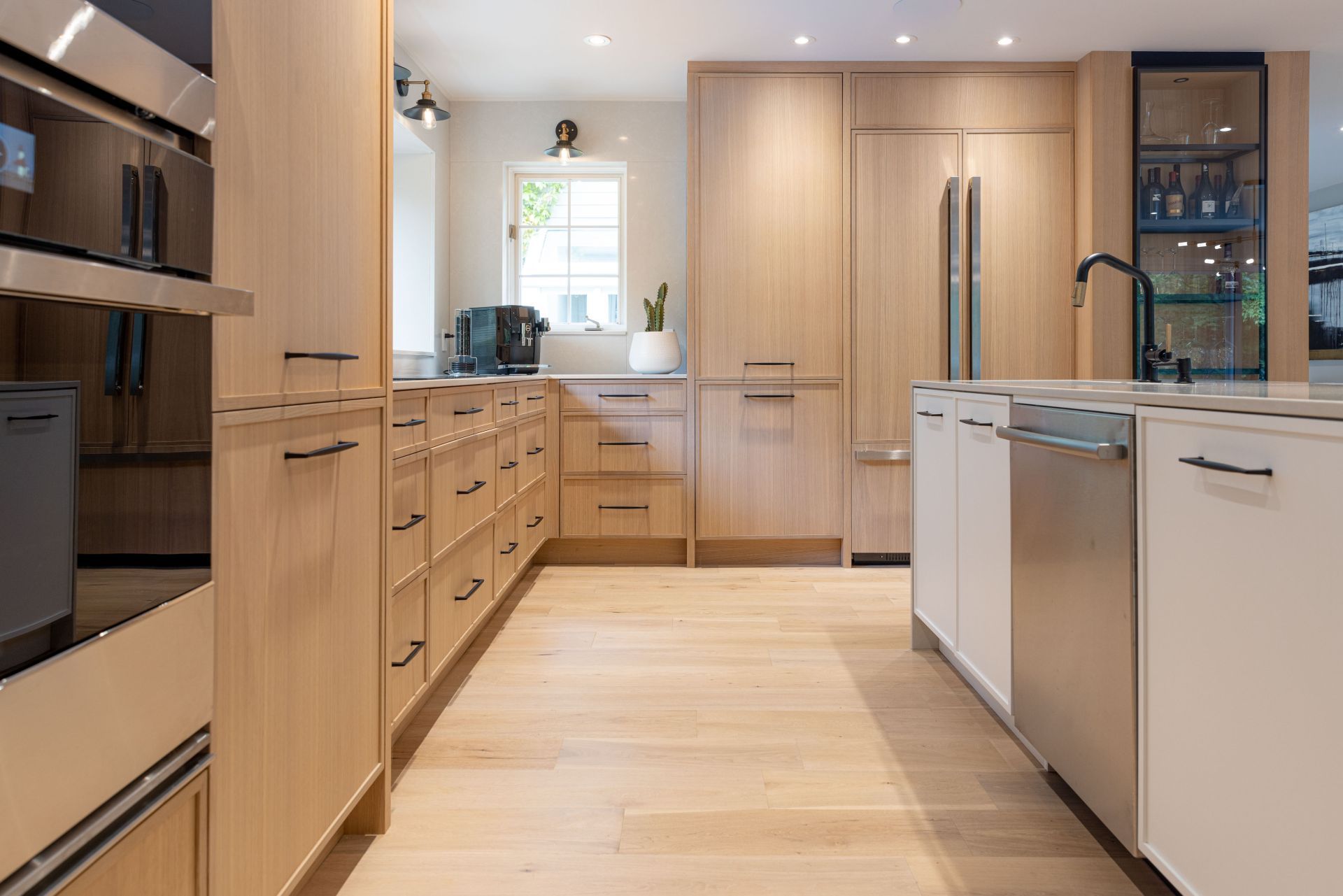 M. Ponce a fait appel à mes services sa maison secondaire à Saint-Adolphe d’Howard. J’ai planifié la cuisine afin que celle-ci soit plus ouverte sur l’aire de vie. Elle est ainsi plus conviviale. De grandes vitrines ont aussi été aménagées. Une fois allumées le soir, elles créent une belle ambiance feutrée dans la salle à manger. Le chêne blanc Rif Cut est en vedette dans cette magnifique cuisine, dû à son grain raffiné et sa teinte douce et chaleureuse.