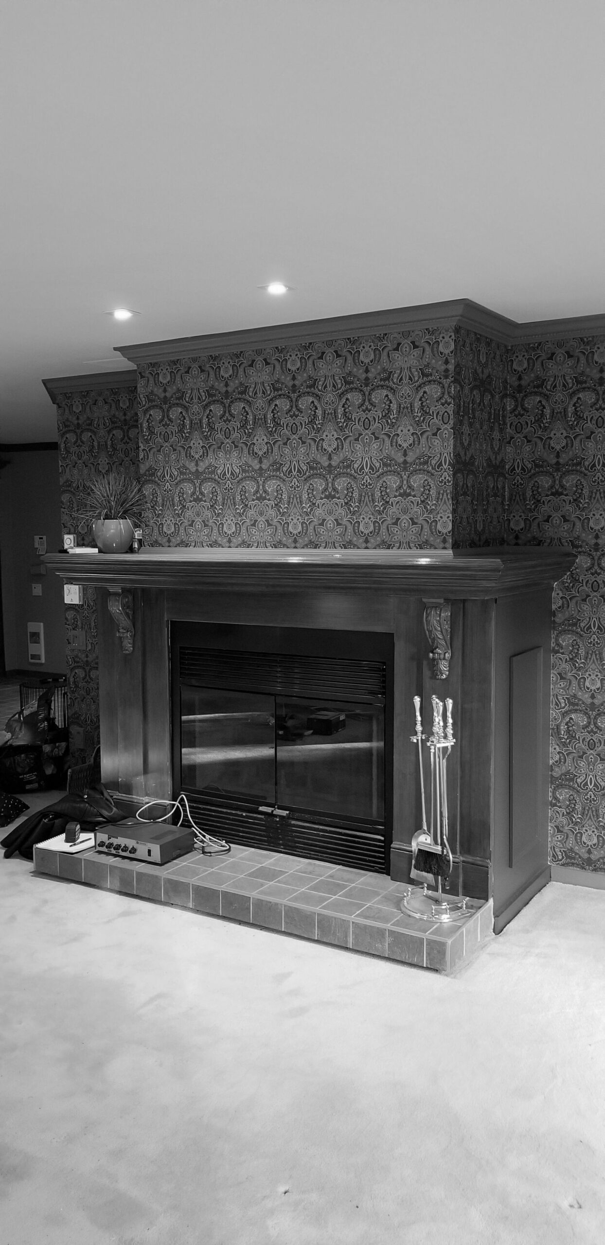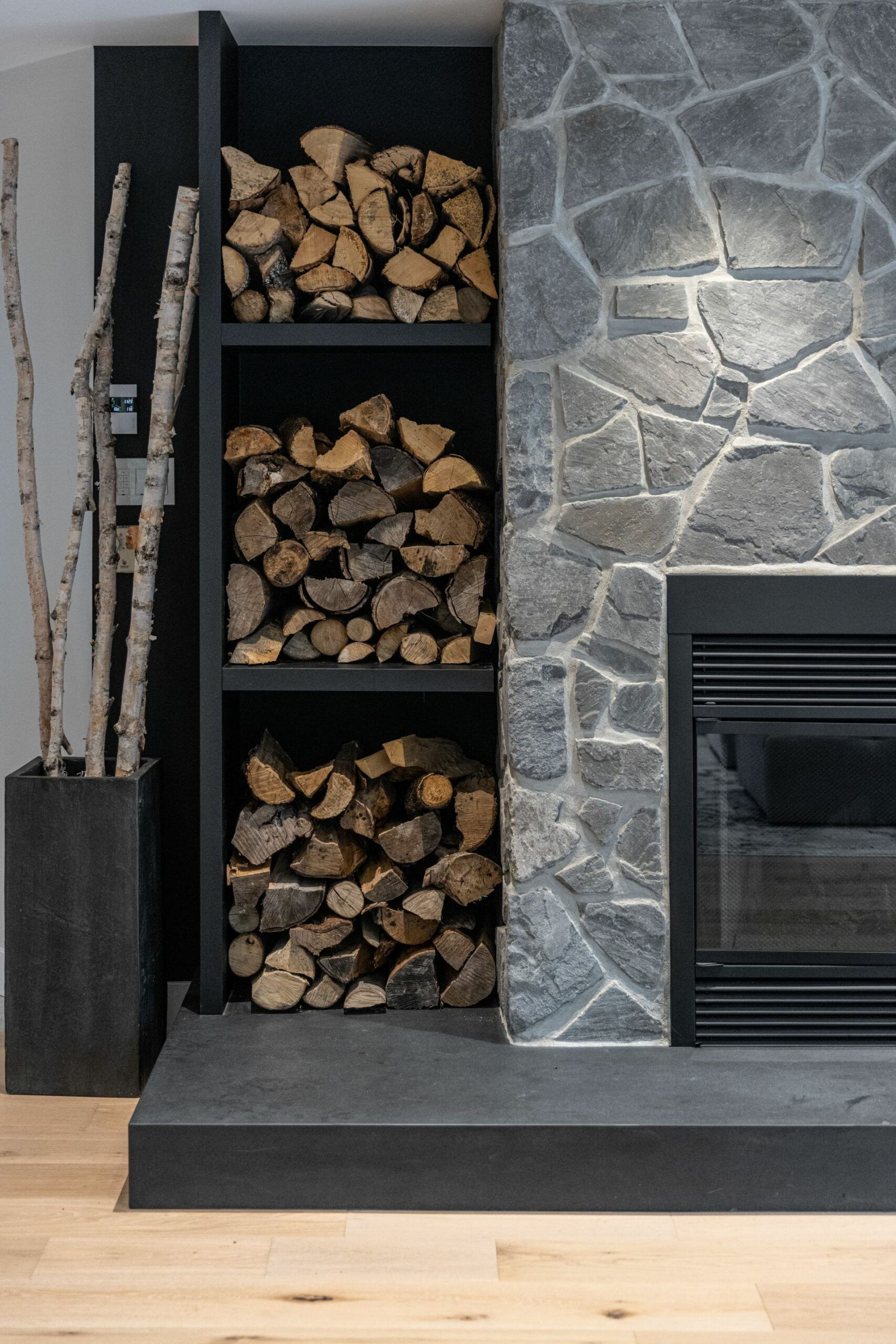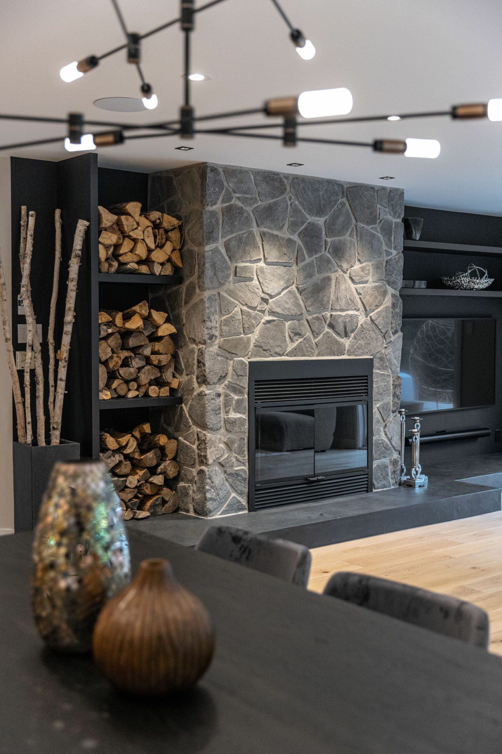 Pour le foyer, j’ai complètement repensé l’espace entourant celui-ci. J’ai choisi une belle pierre de type Field Stone pour le manteau de foyer pour son cachet et son allure rustique qui se marie bien avec le style contemporain. J’ai créé des caissons ouverts pour exposer les bûches et j’ai choisi une ardoise noire pour faire la base qui souligne et uni le foyer et le coin télévision. Le tout insuffle un côté très chaleureux au salon.