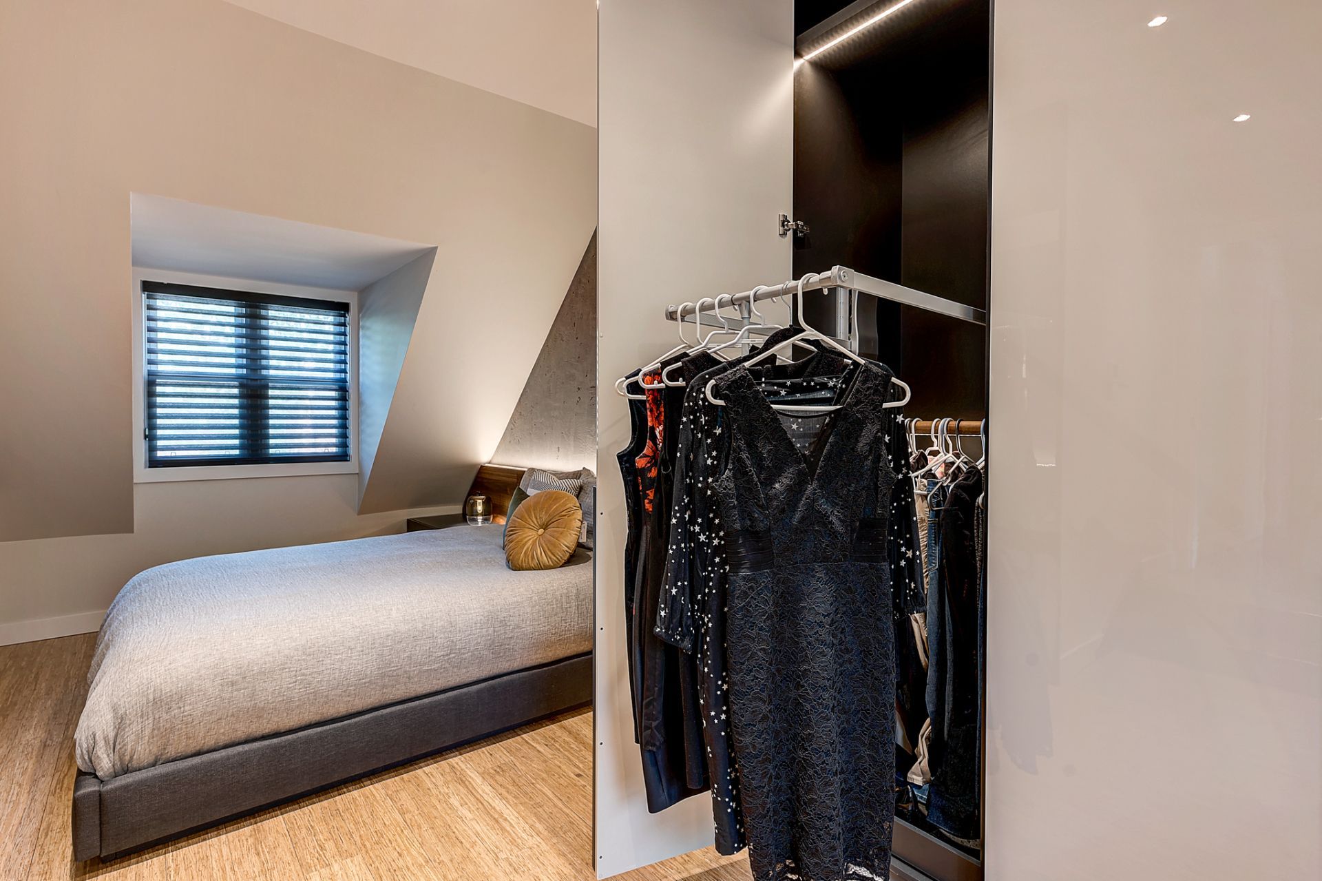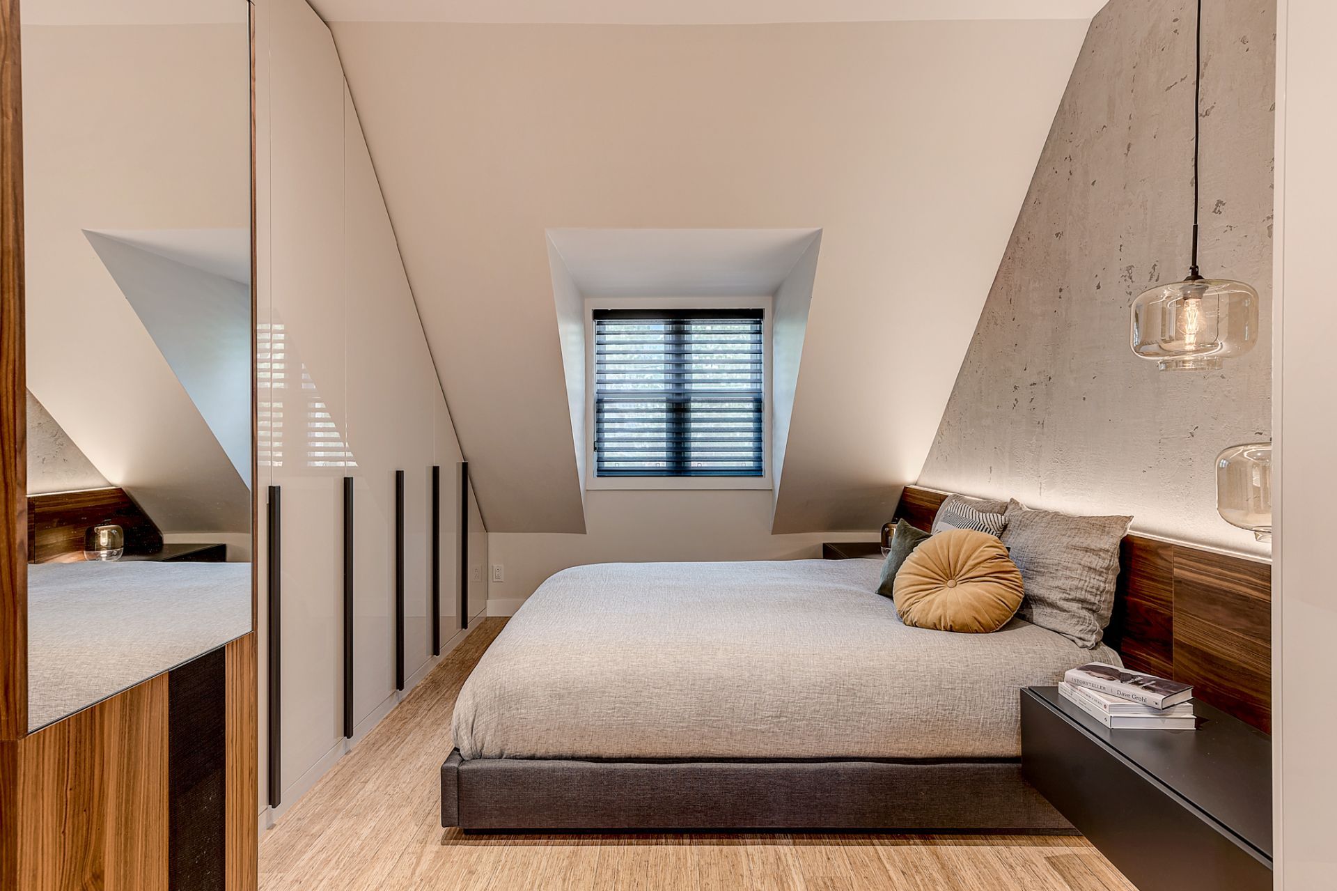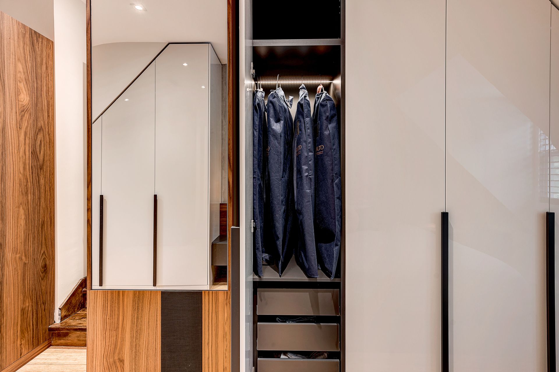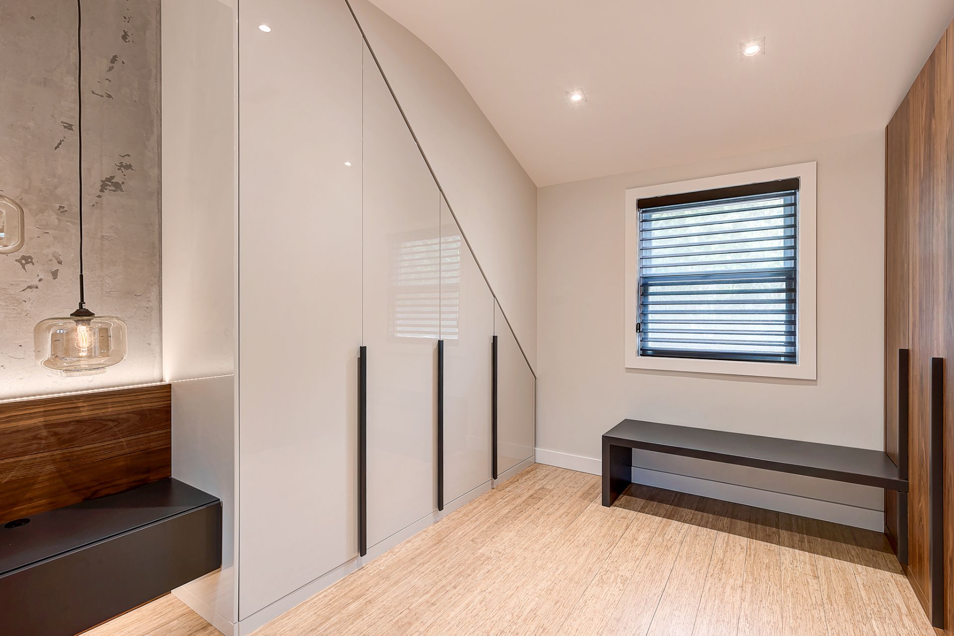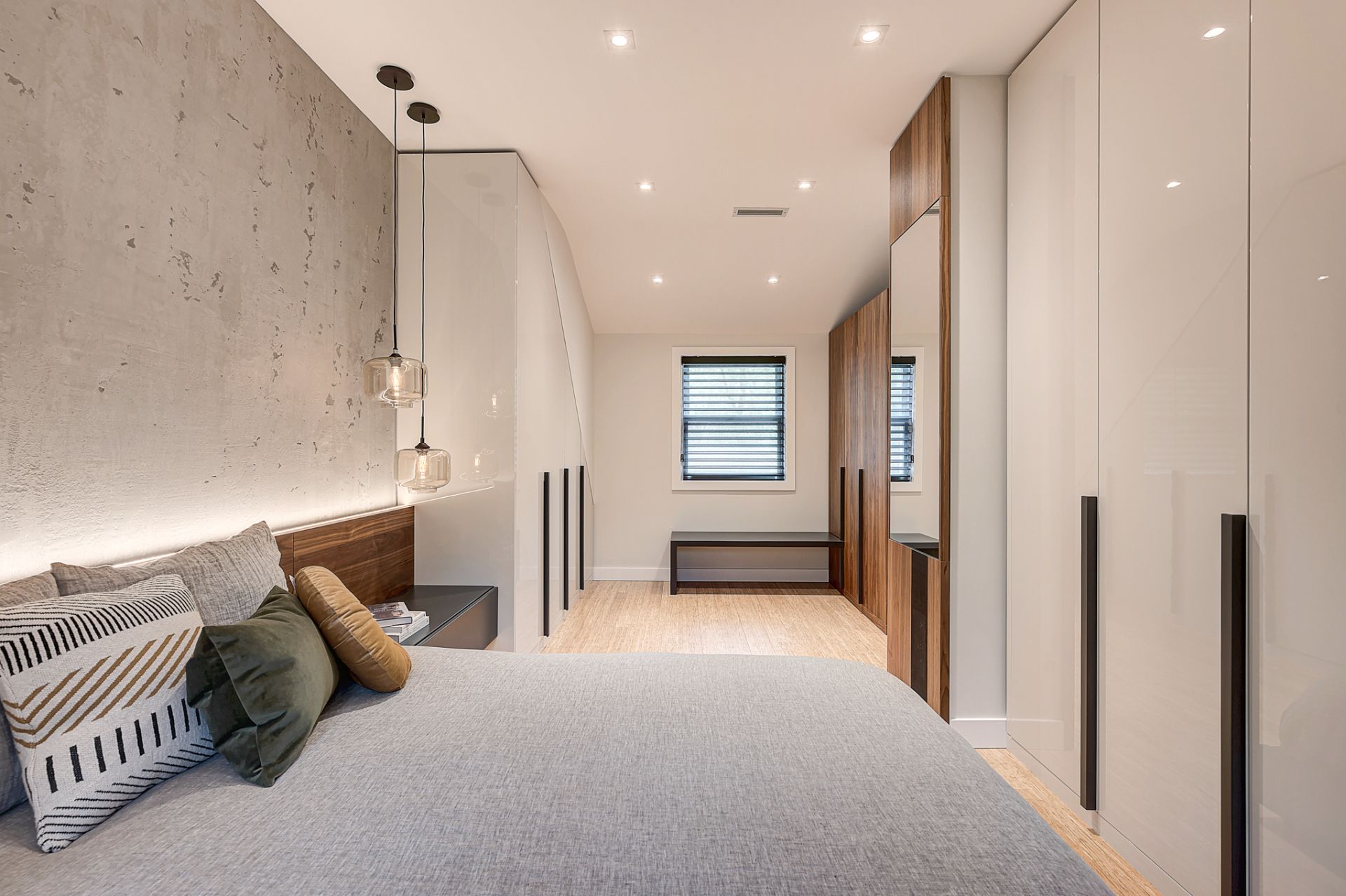 La chambre principale a été complètement rénovée, mis à part le plancher de bambou que Patrick souhaitait conserver. La chambre manquait cruellement de rangement. J’ai donc conçu un design totalement sur mesure pour maximiser le rangement jusqu’au plafond. J’ai prévu de grandes armoires munies de tiroirs, de tringles avec éclairage intégré et de tringles articulées qui se tirent vers le sol pour faciliter l’accès à sa conjointe. Deux finis ont été sélectionnés; une laque claire ultra lustrée pour refléter la lumière et donner un effet de grandeur à la chambre et du noyer pour son côté chaleureux et raffiné. J’ai aussi imaginé une tête de lit en noyer pour faire un rappel des armoires qui sont situées à l’opposé de la pièce. La base de lit rembourré a aussi été faite sur mesure. Pour une touche de contraste, j’ai choisi une laque mat gris foncé pour les tables de chevet flottantes, le banc et les poignées des armoires. Ces dernières procurent d’ailleurs du rythme à la pièce. Pour finir, j’ai complètement repensé l’éclairage de la chambre, car l’ambiance lumineuse est primordiale dans tout espace de vie. Des encastrés au plafond ont été prévus, des luminaires suspendus ont été choisis pour leur caractère distingué et un rétroéclairage a été prévu à la tête de lit pour mettre en valeur la magnifique texture du béton créé par mon artiste peintre.