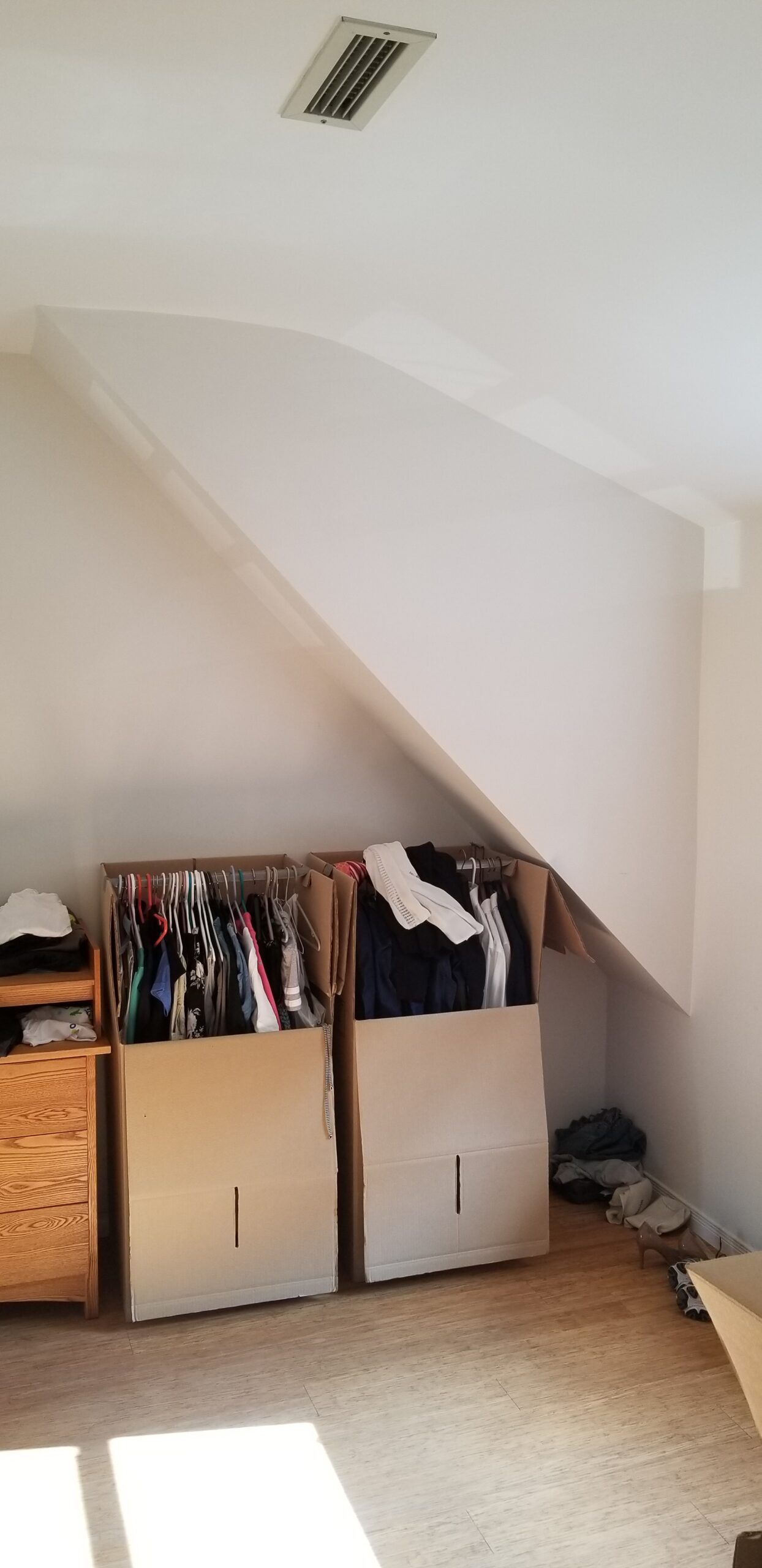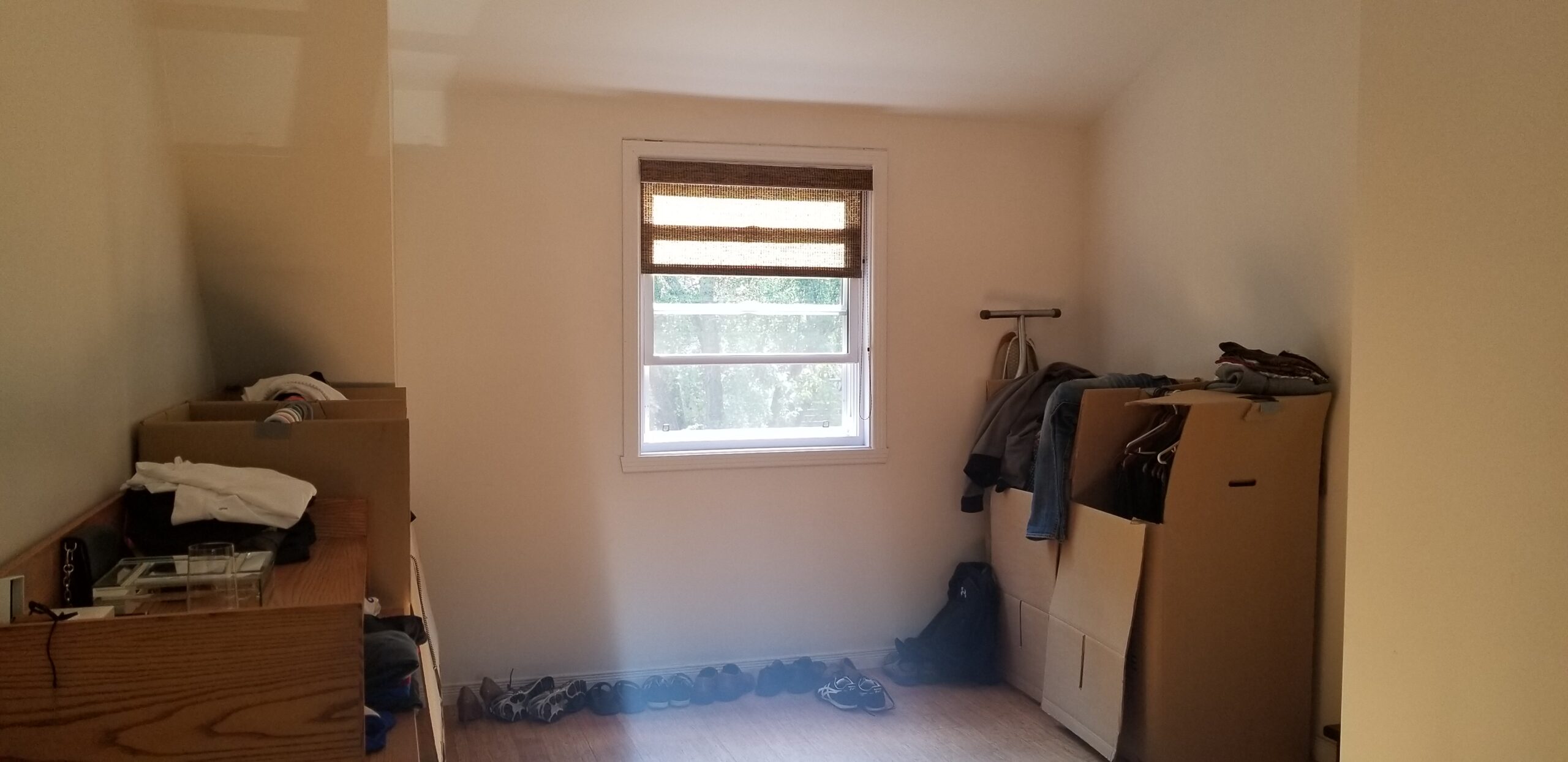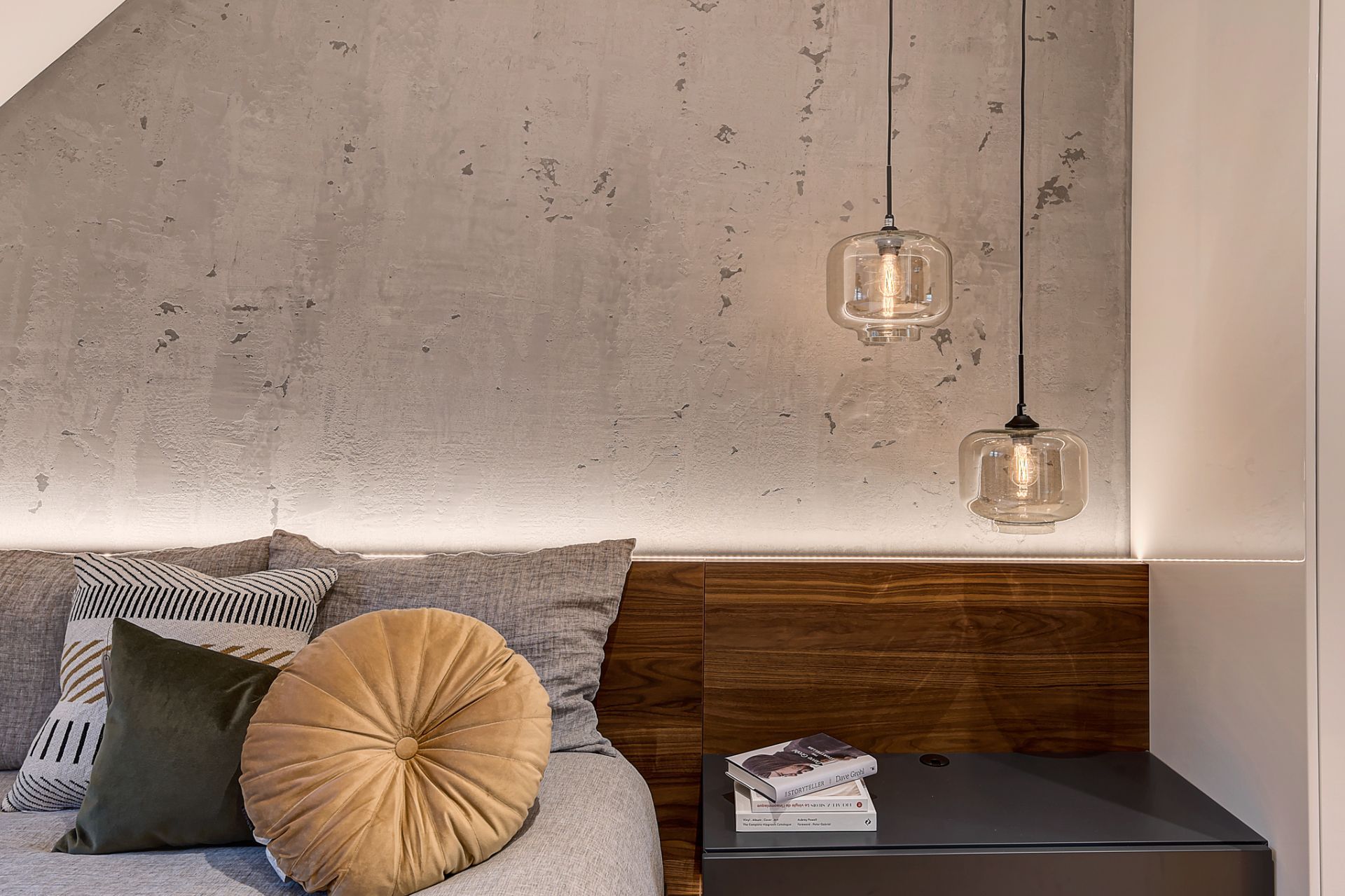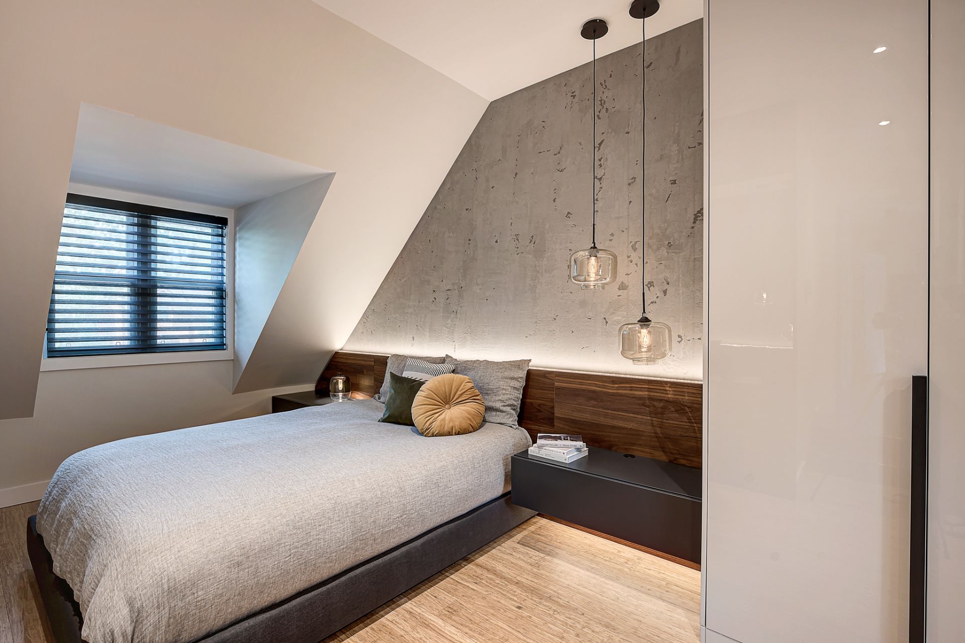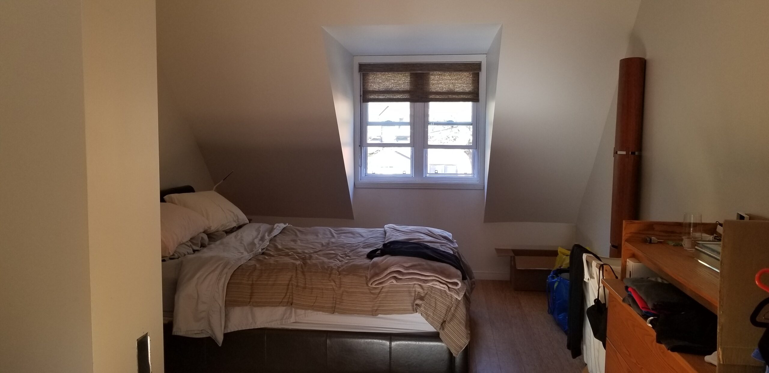 La chambre principale a été complètement rénovée, mis à part le plancher de bambou que Patrick souhaitait conserver. La chambre manquait cruellement de rangement. J’ai donc conçu un design totalement sur mesure pour maximiser le rangement jusqu’au plafond. J’ai prévu de grandes armoires munies de tiroirs, de tringles avec éclairage intégré et de tringles articulées qui se tirent vers le sol pour faciliter l’accès à sa conjointe. Deux finis ont été sélectionnés; une laque claire ultra lustrée pour refléter la lumière et donner un effet de grandeur à la chambre et du noyer pour son côté chaleureux et raffiné. J’ai aussi imaginé une tête de lit en noyer pour faire un rappel des armoires qui sont situées à l’opposé de la pièce. La base de lit rembourré a aussi été faite sur mesure. Pour une touche de contraste, j’ai choisi une laque mat gris foncé pour les tables de chevet flottantes, le banc et les poignées des armoires. Ces dernières procurent d’ailleurs du rythme à la pièce. Pour finir, j’ai complètement repensé l’éclairage de la chambre, car l’ambiance lumineuse est primordiale dans tout espace de vie. Des encastrés au plafond ont été prévus, des luminaires suspendus ont été choisis pour leur caractère distingué et un rétroéclairage a été prévu à la tête de lit pour mettre en valeur la magnifique texture du béton créé par mon artiste peintre.