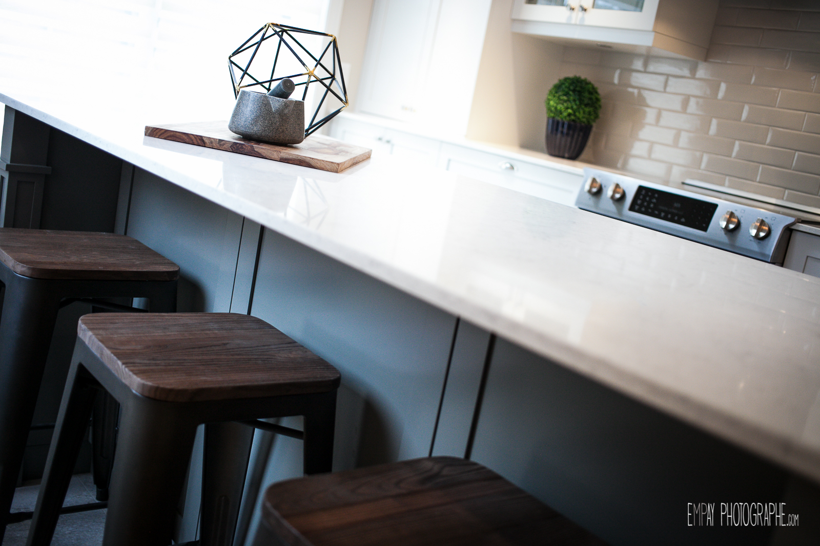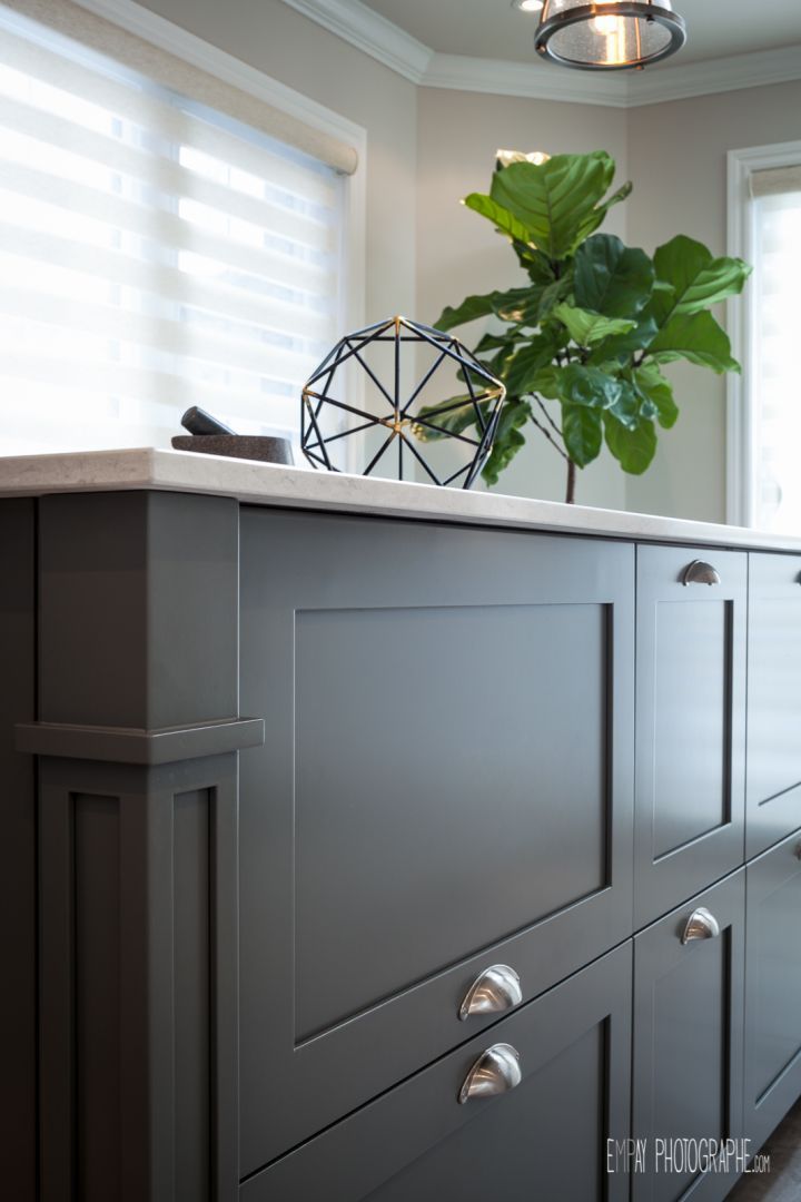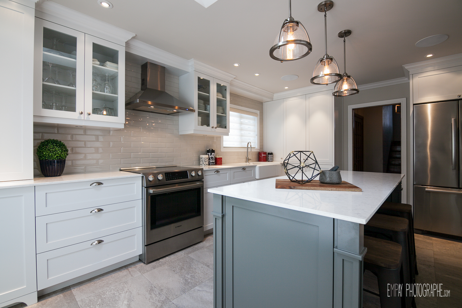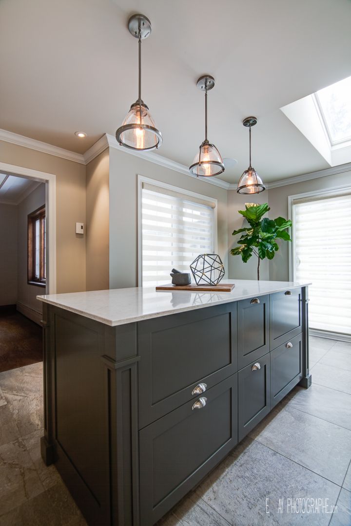Les propriétaires désiraient rénover de A à Z leur cuisine afin que celle-ci puisse y accueillir un bel ilôt. Il se démarque d’ailleurs par sa teinte grise foncée, qui rappelle les veinures des grandes tuiles au sol. Pour le dosseret, des tuiles lustrées de style Subway sont posées jusqu’au ogee, donnant ainsi un effet de grandeur.