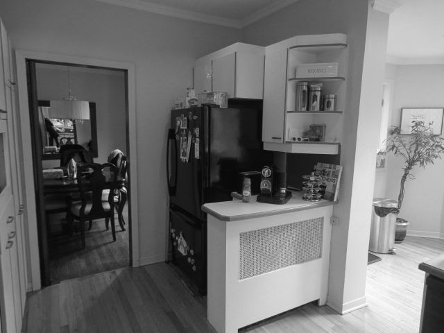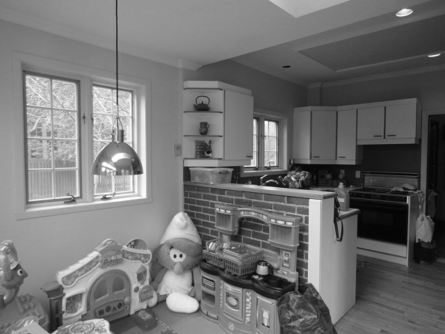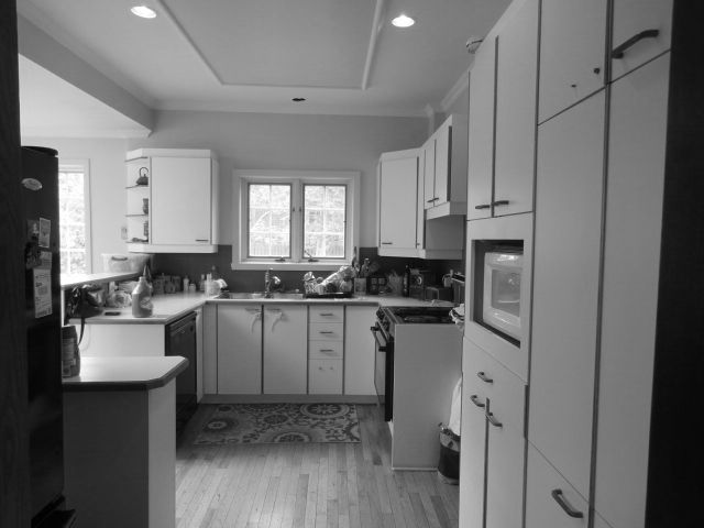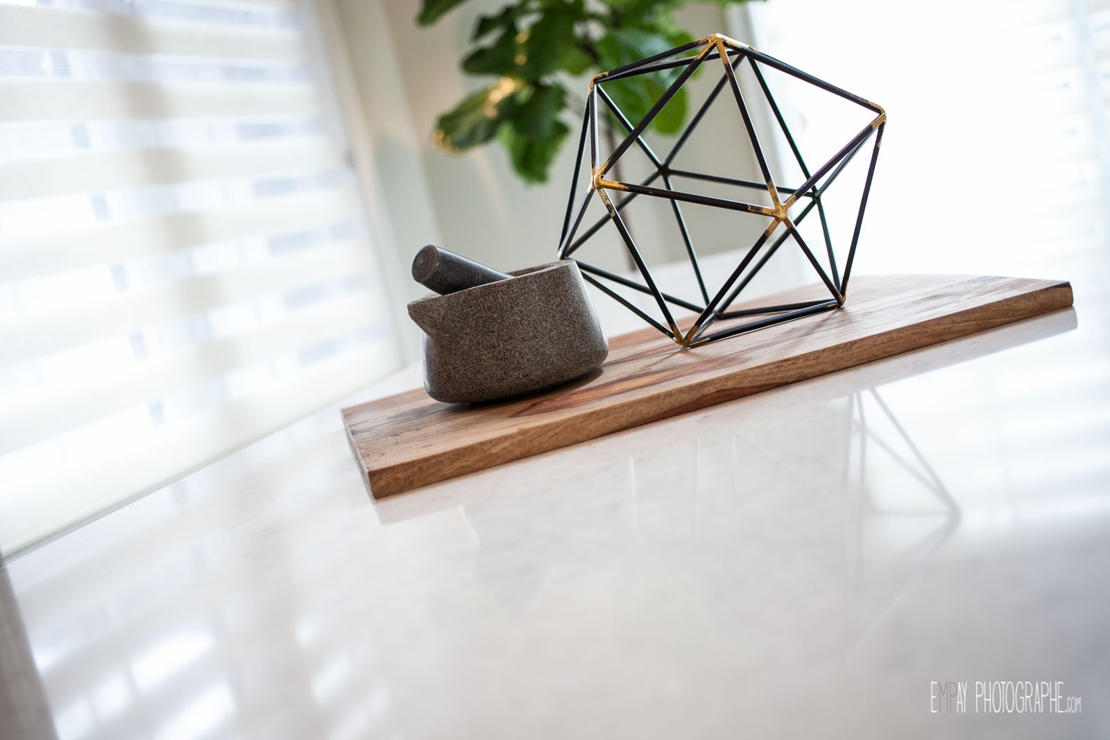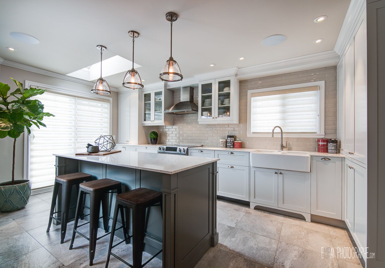 Les propriétaires désiraient rénover de A à Z leur cuisine afin que celle-ci puisse y accueillir un bel ilôt. Il se démarque d’ailleurs par sa teinte grise foncée, qui rappelle les veinures des grandes tuiles au sol. Pour le dosseret, des tuiles lustrées de style Subway sont posées jusqu’au ogee, donnant ainsi un effet de grandeur.