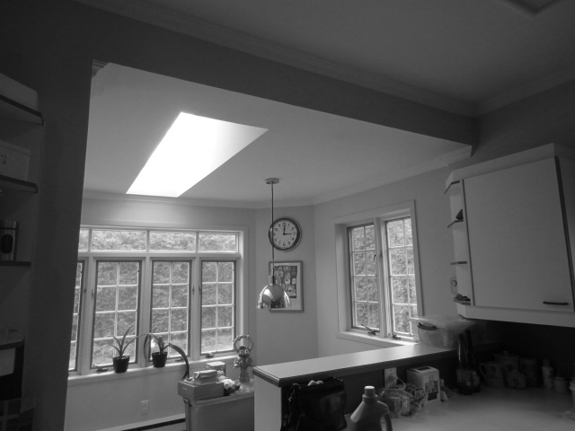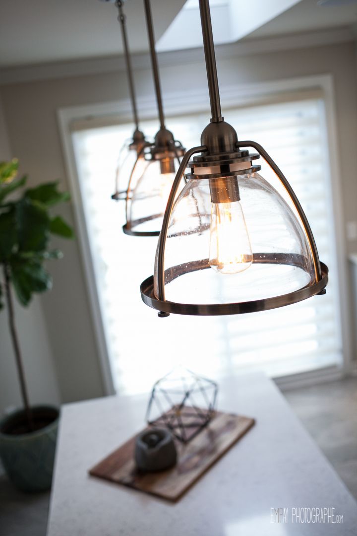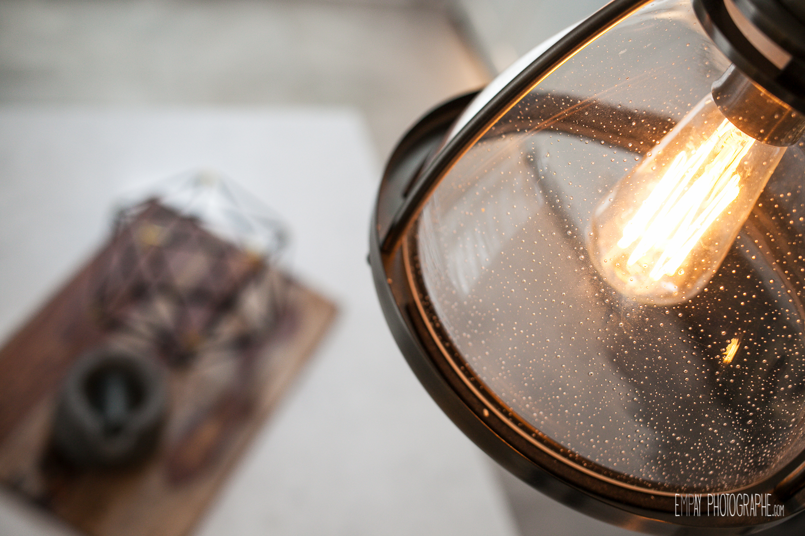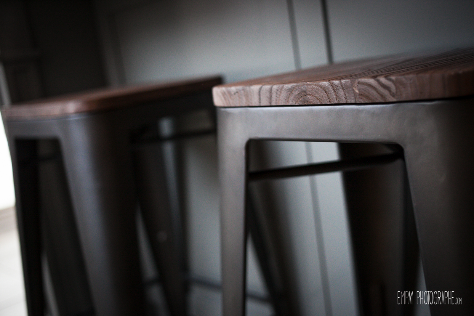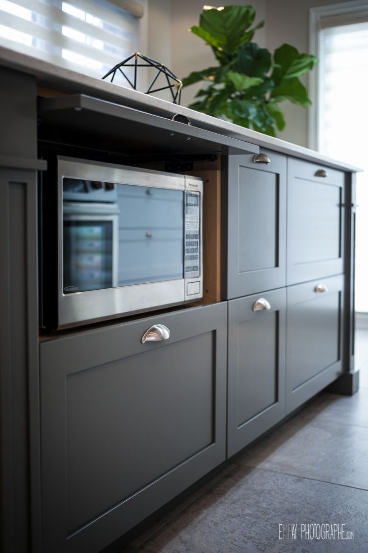 Finalement, un évier en fonte émaillé avec tablier apporte du cachet à la cuisine, 3 luminaires de style industriel surplombent l’ilôt pour rythmer l’espace et le micro-ondes est dissimulé dans l’ilôt par une porte se rétractant au-dessus de celui-ci pour ne pas encombrer qui que ce soit.