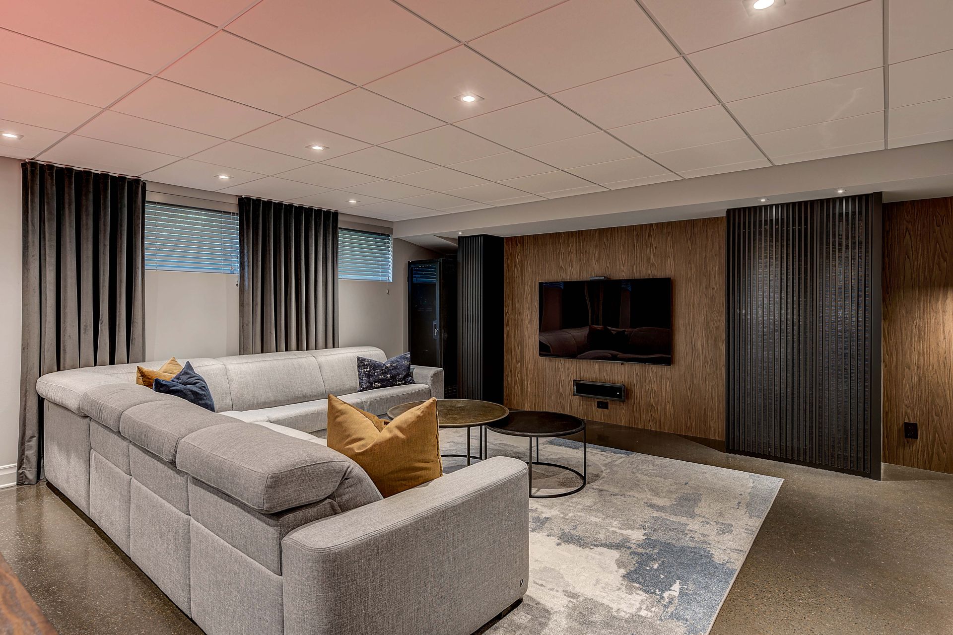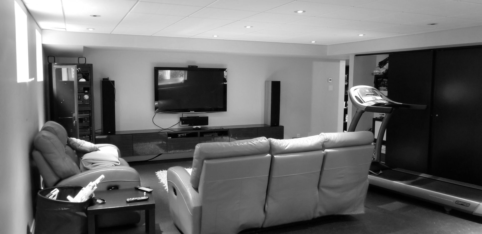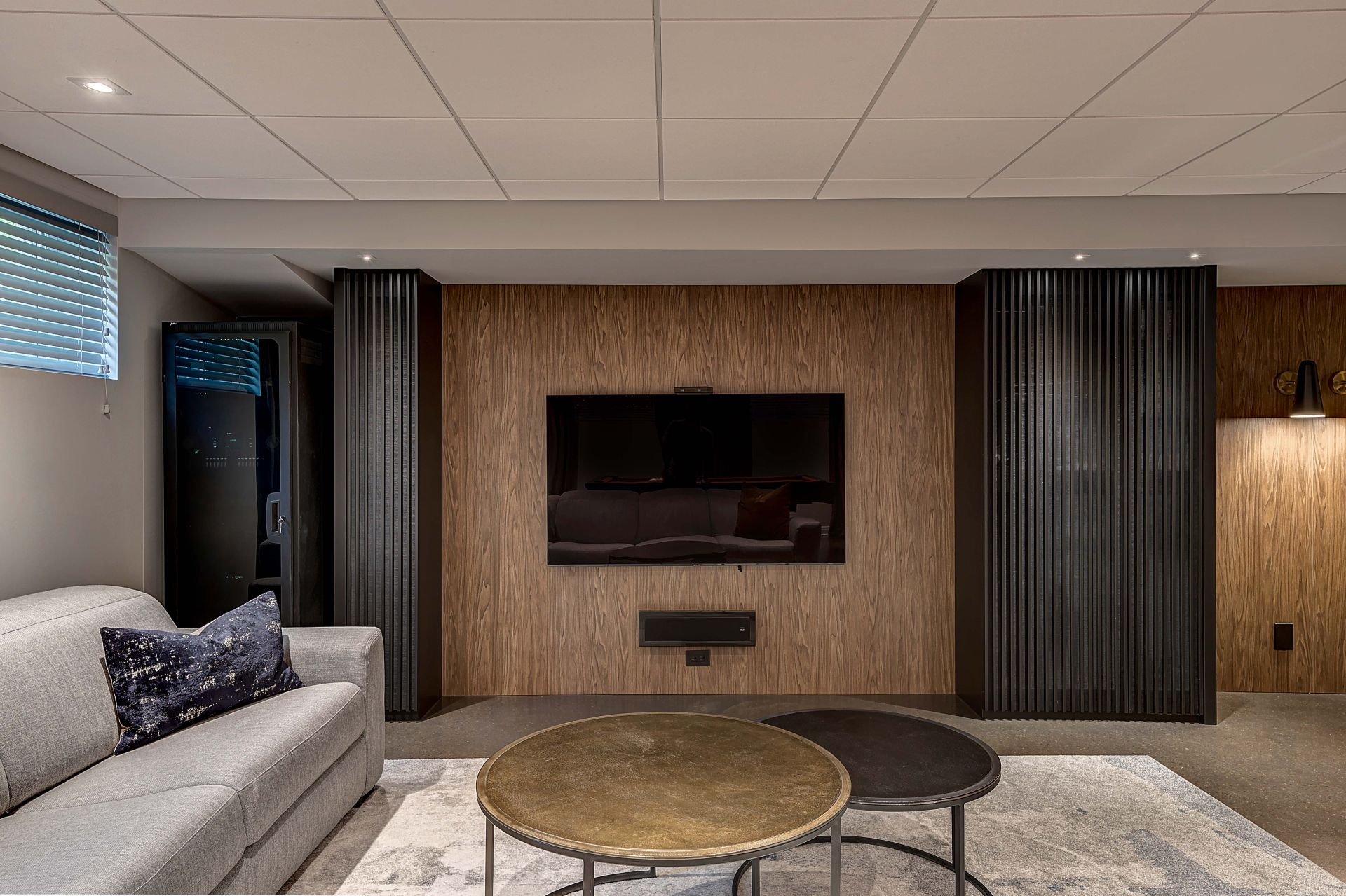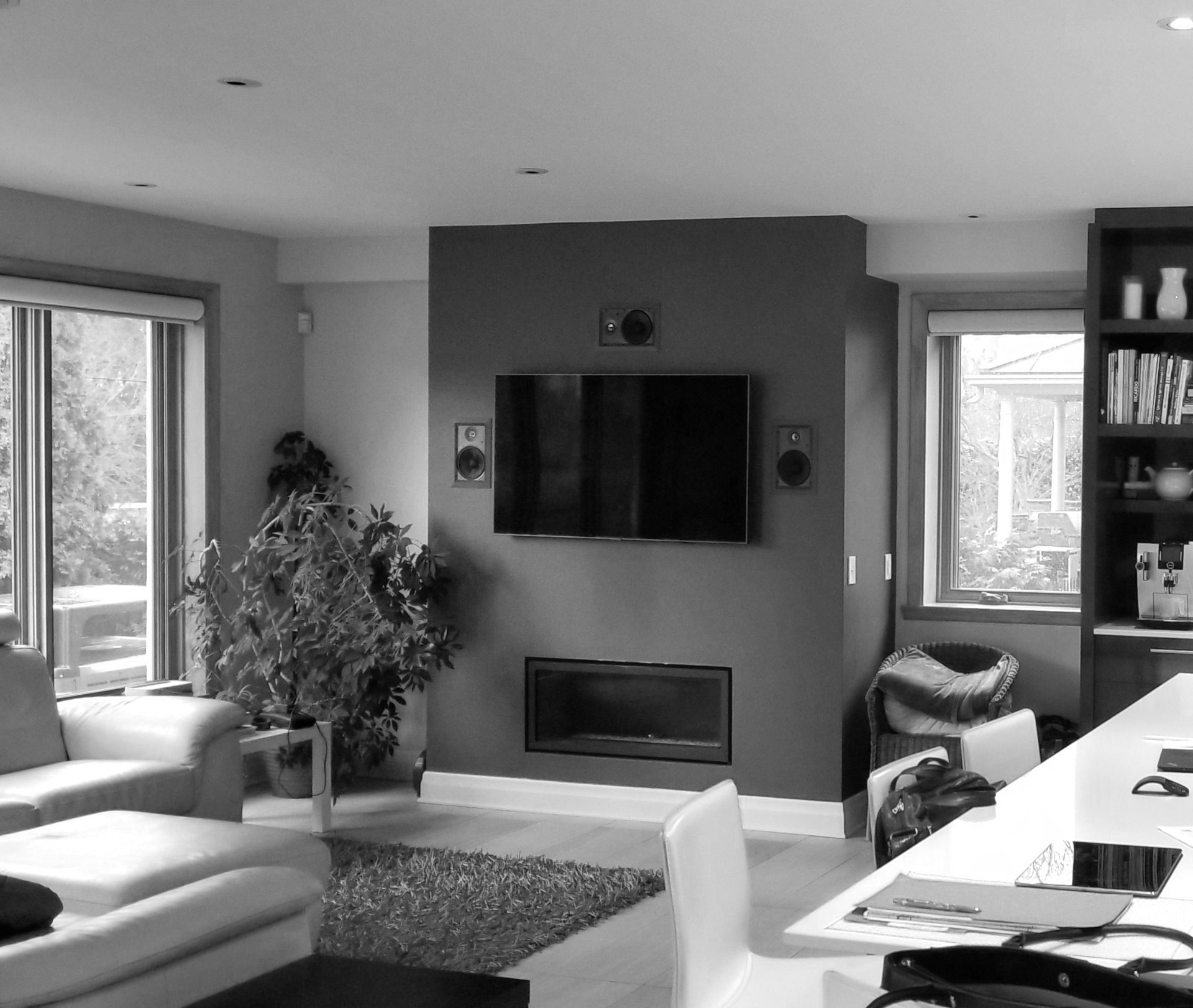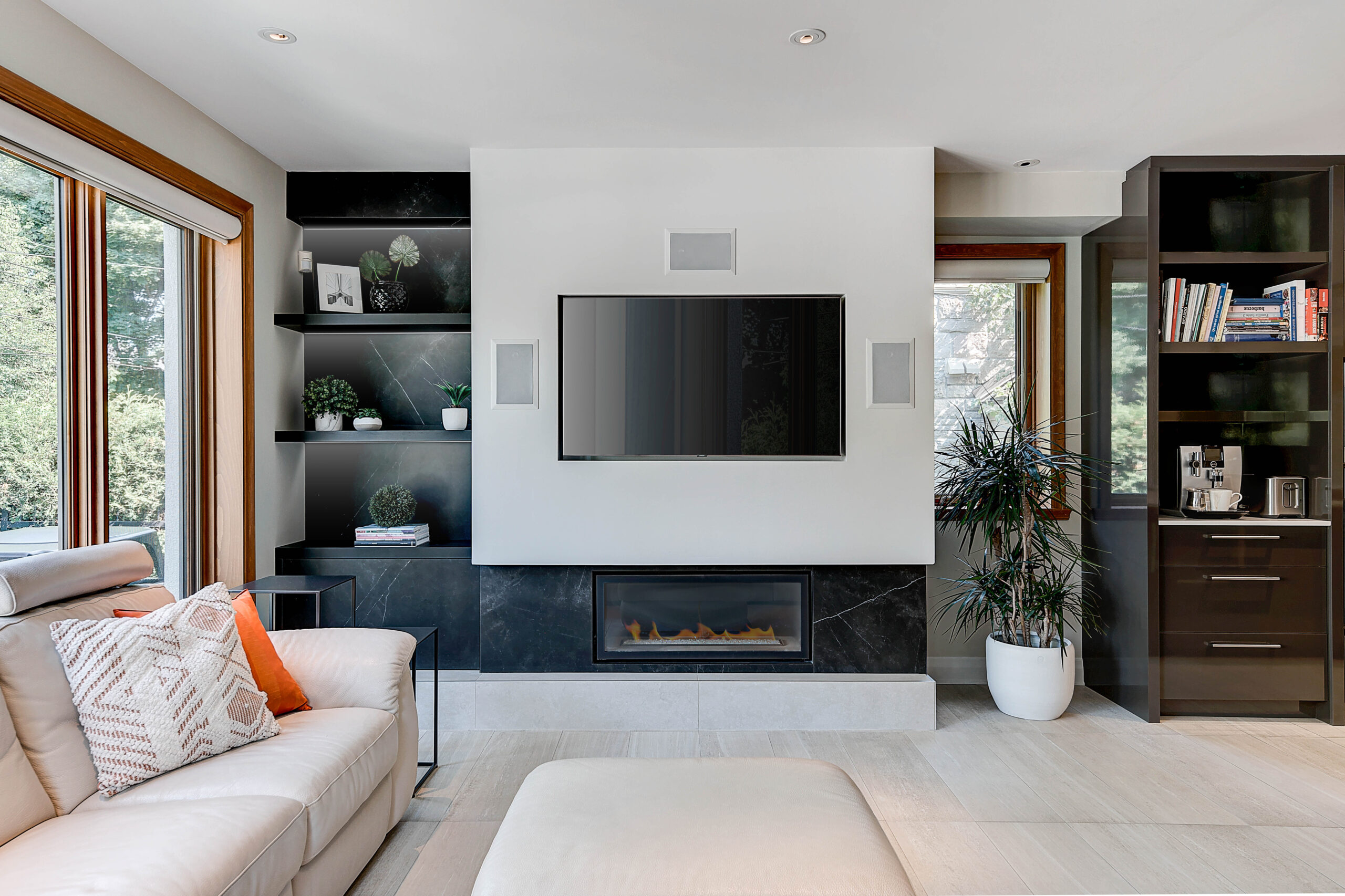Isabelle a fait appel à mes services pour le réaménagement complet de son sous-sol. Elle et son conjoint souhaitaient un endroit élégant et convivial pour leurs soirées en famille et entre amis. Le plafond, le plancher et la télévision étaient à conserver. Je porte votre attention sur les cabinets laqués gris anthracite. Ils ont été conçus sur mesure pour loger tous les appareils et les haut-parleurs, sans nuire à la transmission du son. Le secret : j’ai prévu des portes munies de lattes espacées et d’une toile moustiquaire noire. Très pratique et élégant tout à la fois ! Pour le salon, le mandat était de procurer plus de prestance au foyer, tout en conservant les haut-parleurs encastrés, la télévision et le foyer à leur place. L’idée m’est alors venu d’utiliser de grandes dalles de porcelaine noire au fin veinage pour son raffinement et son intemporalité. La porcelaine couvre la façade du foyer et se poursuit sur le meuble, c’est-à-dire sur la porte du caisson du bas, le fond de l’étagère et la retombée tout en haut. J’ai de plus prévu des LED encastrés sous les tablettes pour créer une belle ambiance le soir venu.