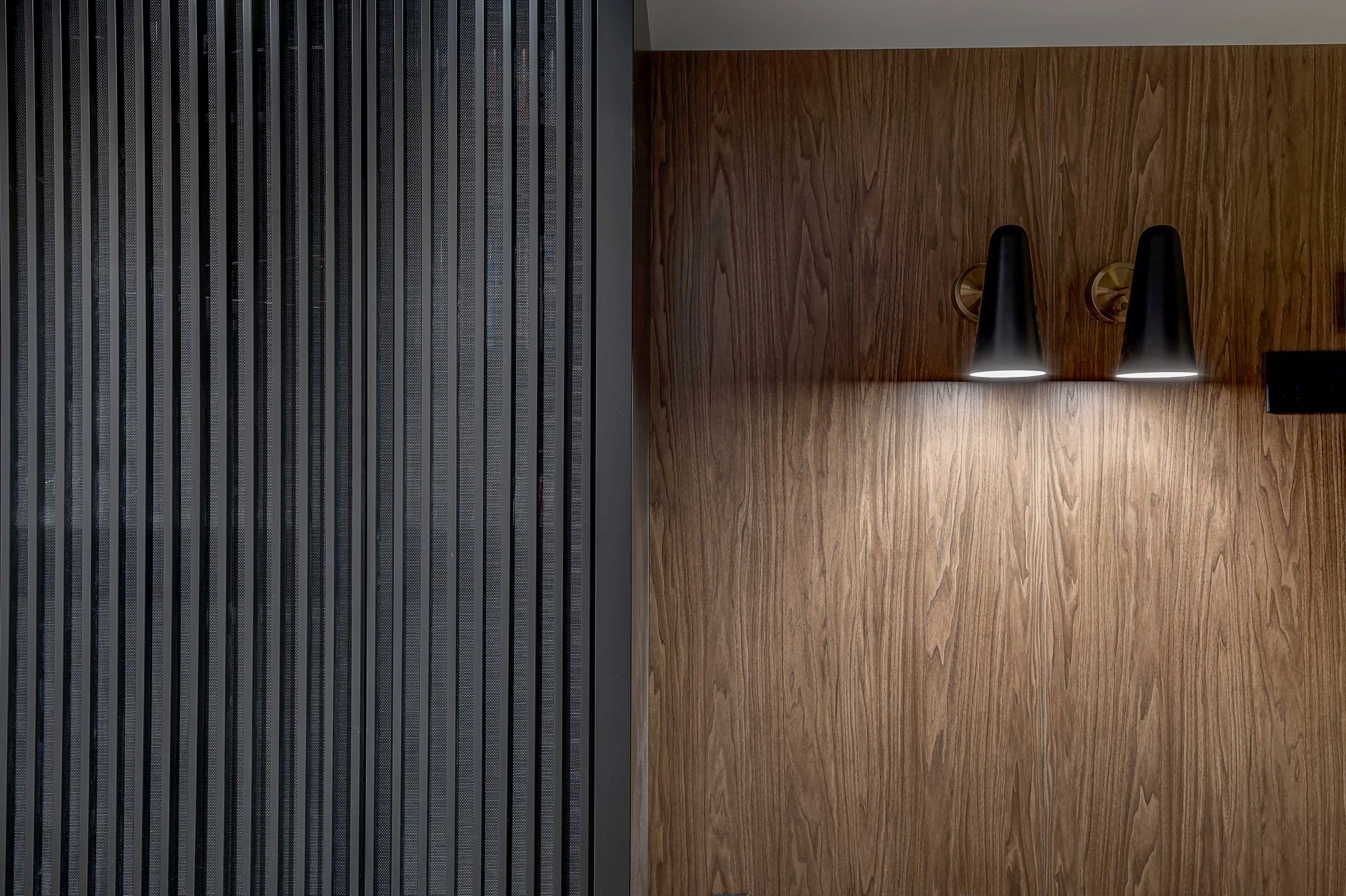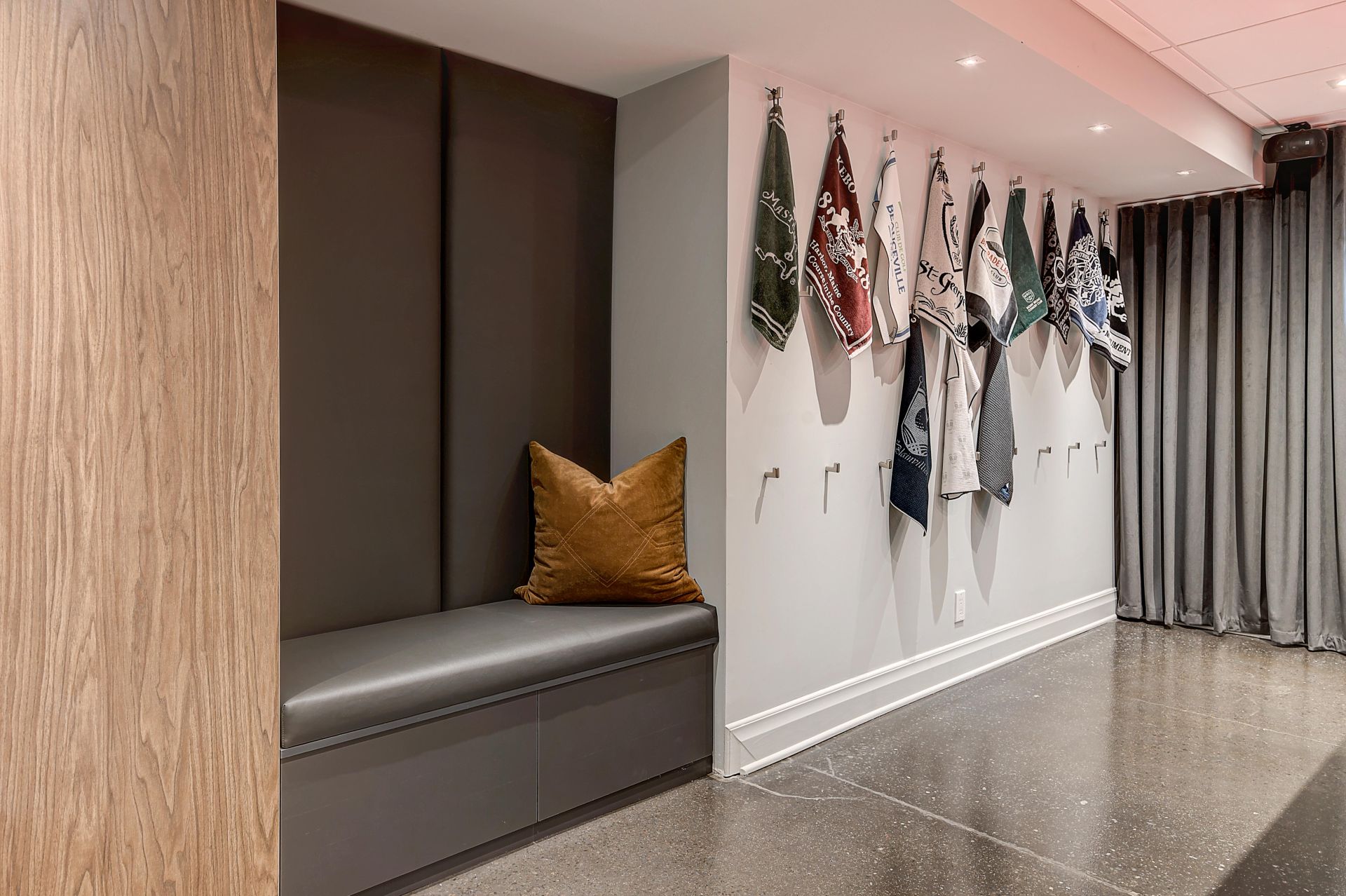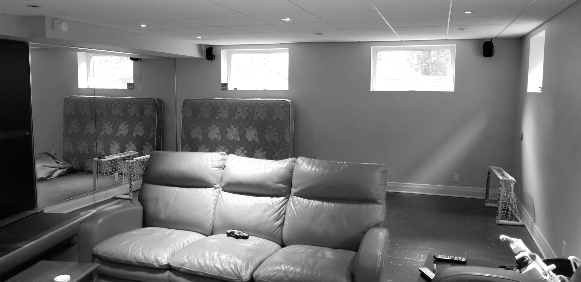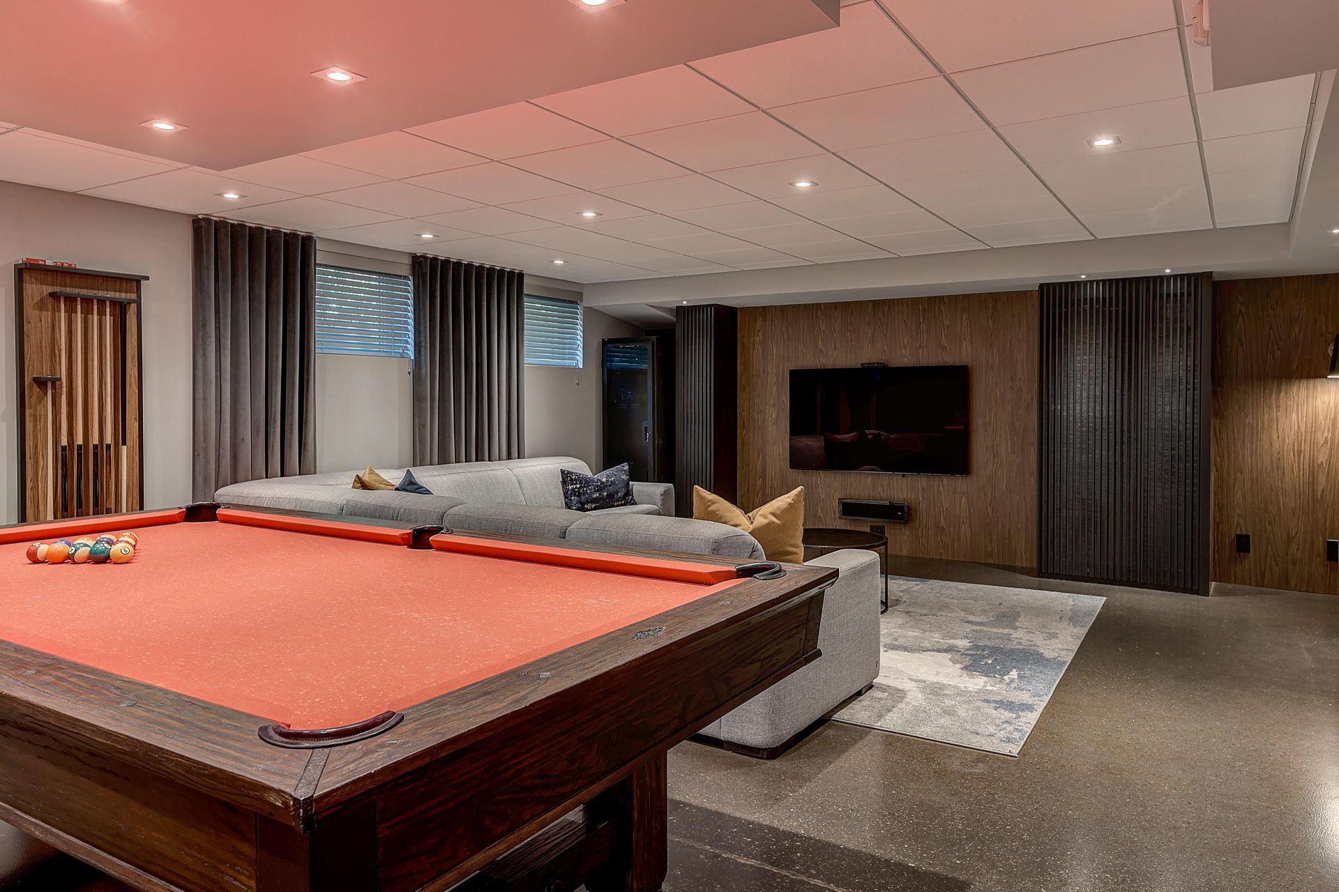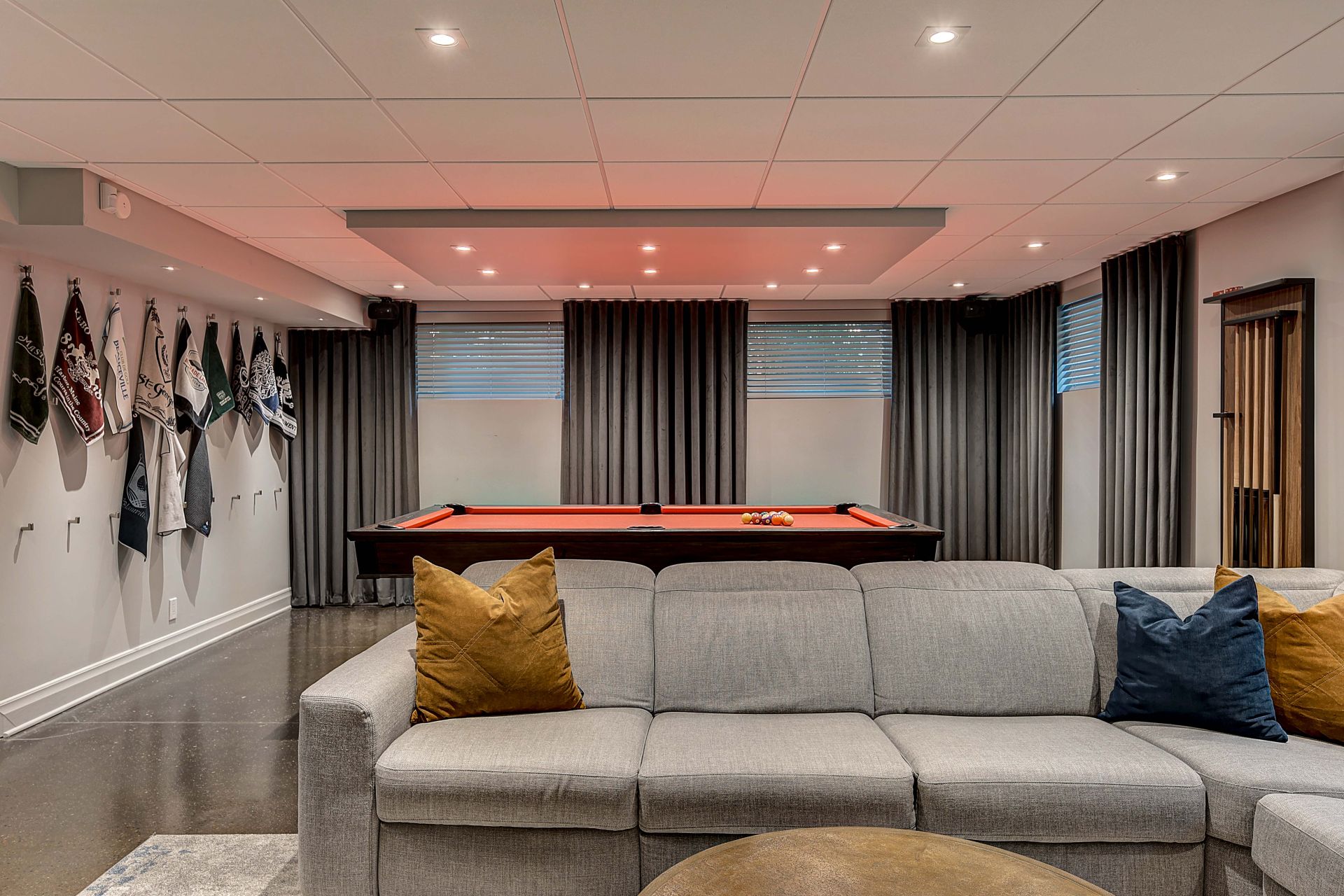 Isabelle a fait appel à mes services pour le réaménagement complet de son sous-sol. Elle et son conjoint souhaitaient un endroit élégant et convivial pour leurs soirées en famille et entre amis. Le plafond, le plancher et la télévision étaient à conserver. Je porte votre attention sur les cabinets laqués gris anthracite. Ils ont été conçus sur mesure pour loger tous les appareils et les haut-parleurs, sans nuire à la transmission du son. Le secret : j’ai prévu des portes munies de lattes espacées et d’une toile moustiquaire noire. Très pratique et élégant tout à la fois ! Pour le salon, le mandat était de procurer plus de prestance au foyer, tout en conservant les haut-parleurs encastrés, la télévision et le foyer à leur place. L’idée m’est alors venu d’utiliser de grandes dalles de porcelaine noire au fin veinage pour son raffinement et son intemporalité. La porcelaine couvre la façade du foyer et se poursuit sur le meuble, c’est-à-dire sur la porte du caisson du bas, le fond de l’étagère et la retombée tout en haut. J’ai de plus prévu des LED encastrés sous les tablettes pour créer une belle ambiance le soir venu.